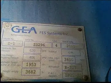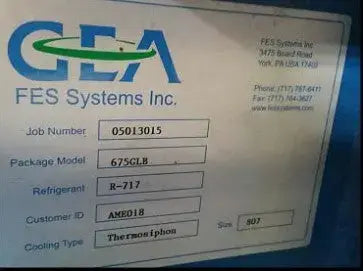 GEA / FES Rotary Screw Compressor Package. Model 675GLB. Year: 2005. Item EC-C-5. FES Contract 05013015. Nominal capacity: 224.5 TR. Setup for a booster application. Includes GEA Micro III. Refrigerant: ammonia. Removed from operation in January/February 2014. Unit has been stored indoors. Package is equipped with: Grasso brand compressor, Thermosyphon Oil Coolers, Shell and Plate style, Oversized Oil Separators, Dual Oil Filters, Motor Temperature and Vibration Sensors, Benshaw motor starter, Ram Industries Motor. Compressor Specs: model Z-1, serial Z0296, mark 4, year 2005, 406 PSIG MDWP, 1953 CFM, R-717. Motor specs: 300 HP, 460V, 3570 RPM, 335 FLA, 445TS Frame, 60 Hz, 3-phase, ODP enclosure. Hours runtime: 53,619. Weight: 16,315 lbs. Overall dimensions: 78 in. W x 177 in. L x 115 in. H.