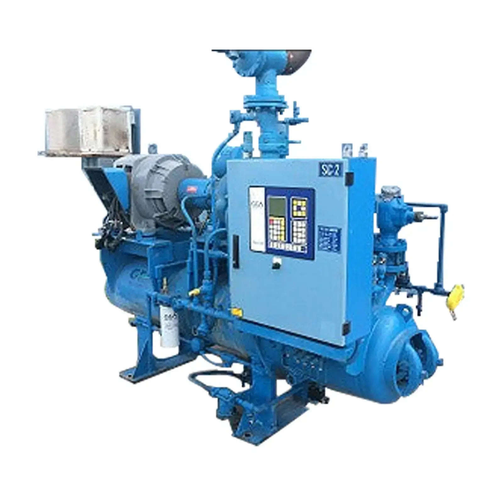 GEA / FES Screw Compressor Model 160GM. FES Contract 04361011. Item SC11. Design suction pressure: 28.4 PSIG. Design suction temperature: +15F. Nominal capacity: 154.9 TR. Design discharge pressure: 165.9 PSIG. Design discharge temperature: +90 F. Brake horsepower: 177.4 BHP. Features a rotary screw compressor manufactured by Grasso, previously run with ammonia refrigerant. Compressor model: M-5, serial M0705, year 2004, 490 CFM, R-717. The Grasso M has a cooling capacity of (NH3 ammonia): 165 KW at -35C/+35F and 637 KW at 0C/+35C (47 TR at -31F/+95F and 181 TR at +32F/+95F). Siemens electric motor: 200 HP, 3570 RPM, 460V, 223 amps, 60 Hz, 3-phase, ODF, Frame 444TS. Ram Industries motor starter. Hours runtime: 29,760. Overall dimensions: 9 ft. L x 4 ft. 4 in. W x 6 ft. High (8’7” high to the top of the pipe cap).