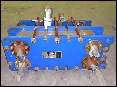 2008 GEA FES Systems Plate Heat Exchanger for Ammonia / Glycol service. Model: 4WP-A2-1. Nat’l Bd.: 9784. Year: 2008. S/N: G2008000241. Drawing: 0800241 REVO. FES Job No.: 08115-16. MAWP Chamber 1: H1 and H3, 150 PSIG at 185F. MAWP Chamber 2: H2 and H4, 250 PSIG at 185F. MDMT Chamber 1: H1 and H3, -20F at 150 PSIG. MDMT Chamber 2: H2 and H4, -20F at 250 PSIG. Test Pressure: 195 PSIG, 325 PSIG. Operating Temp: 185F max, -20F min. Platage Dim (L) Max/Min: 9.375 in / 9.25 in. Platage dim based on: 34 plates, 0.5 MM thick. Certified by APV Products, Heat Transfer-Goldsboro. GEA Division. RVS Vessel: 20656. Certified by Refrigeration Valves & Systems Bryan, TX. MAWP 300 PSI at 300F. MDMT -50F at 300 PSI. S/N: 43488. Year: 2008.