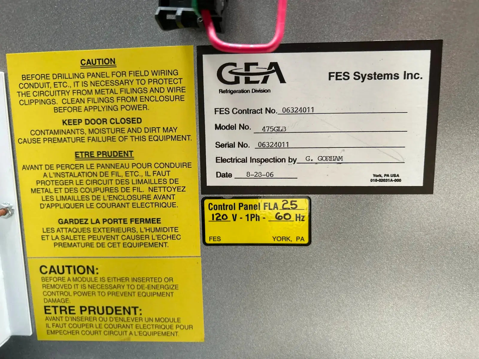 GEA/FES Micro III Control Panel. Type: Micro III. Serial No: 06324011. FES Contract No: 06324011. Control Panel Power Supply: 120 Volts, 1 PH, 60 Hz. FLA: 25.