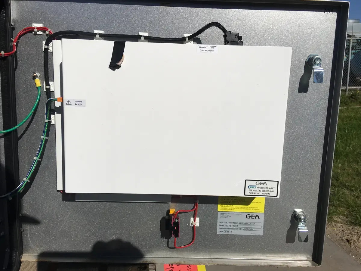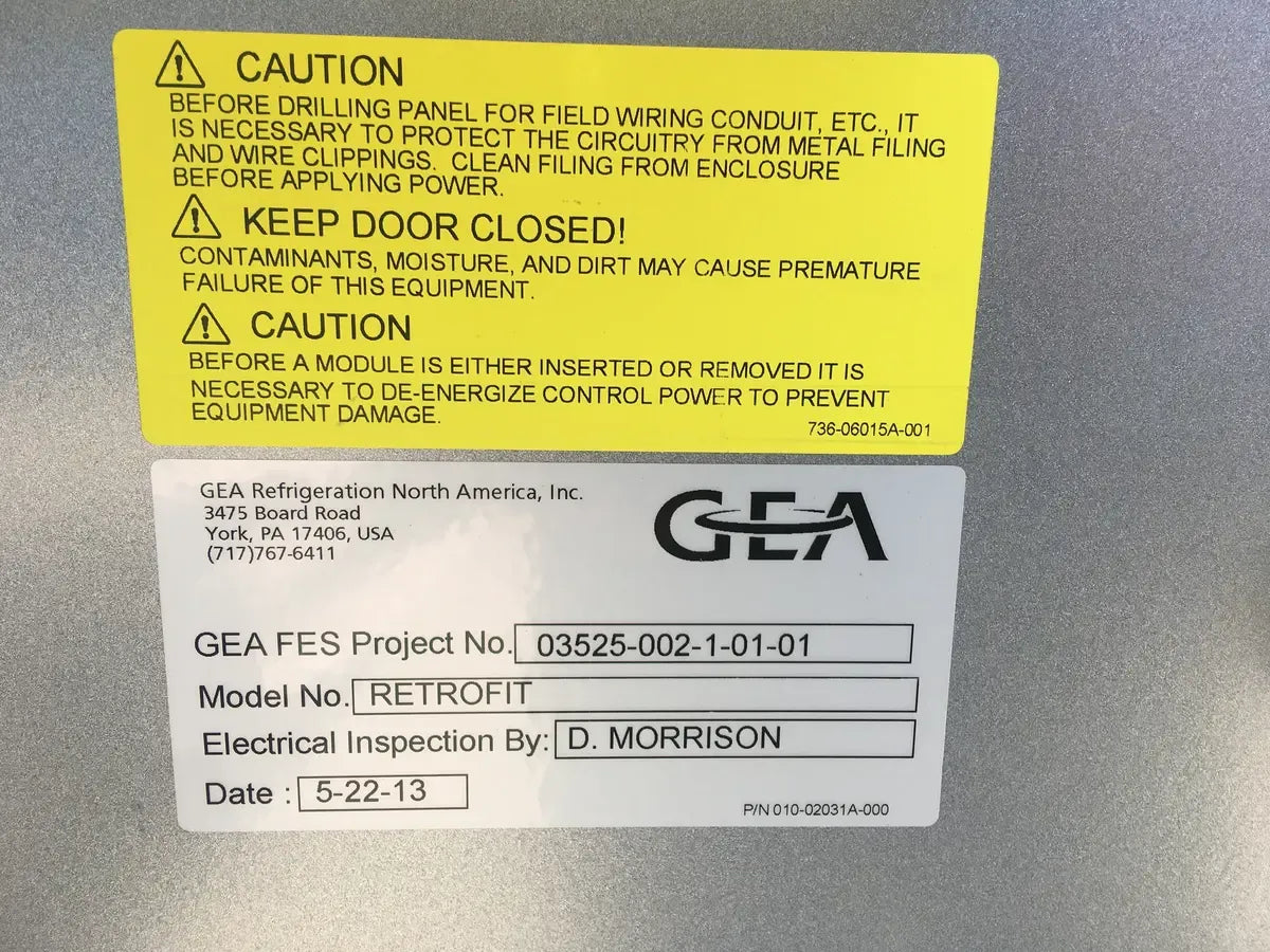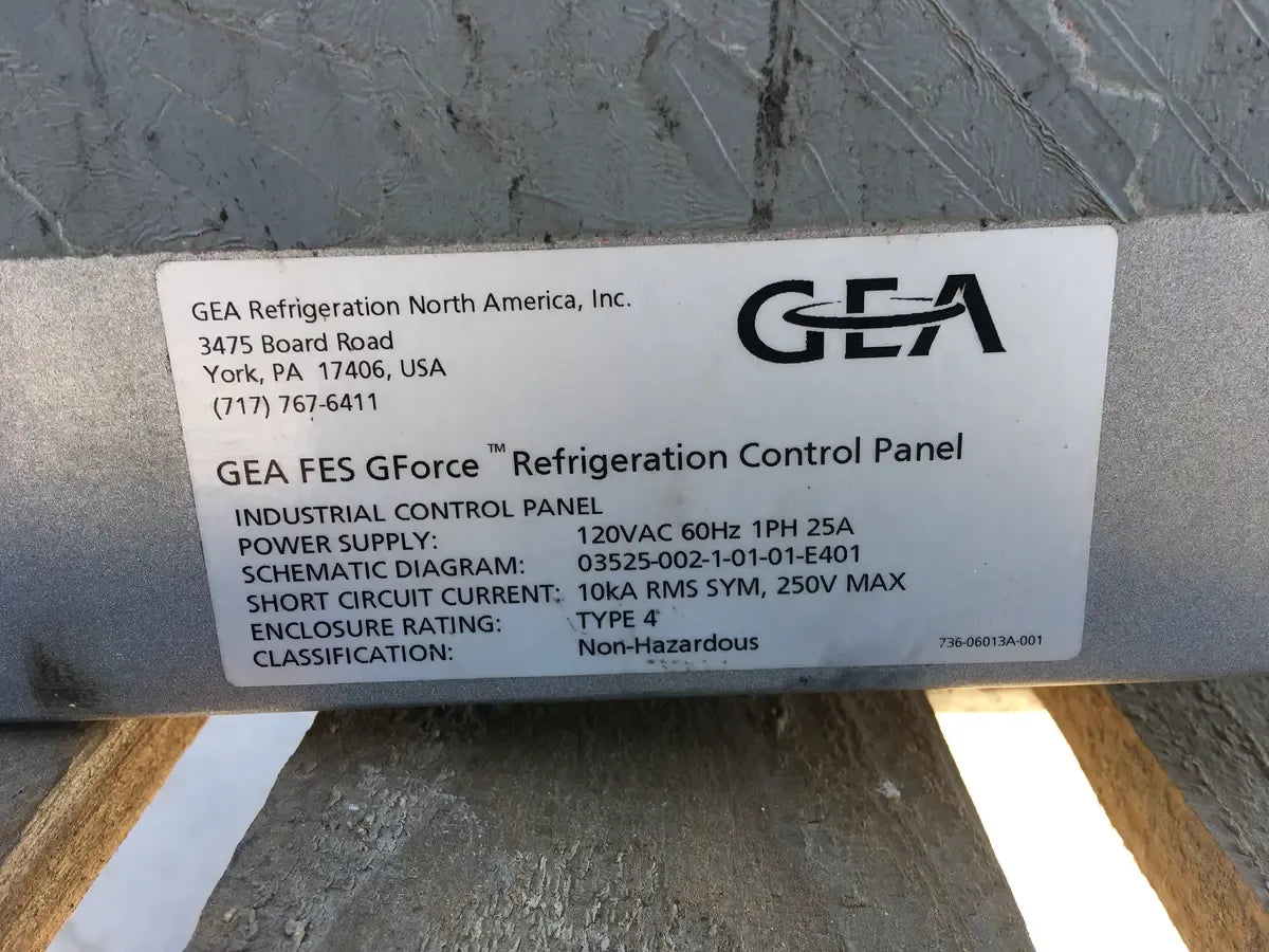 GES FES GForce Refrigeration Control Panel Industrial Control Panel Power Supply: 120Vac, 60Hz, 1Ph, 25A Schematic DiagRam Industries: 03525-002-1-01-E401 Short Circuit Current: 10kA RMS SYM, 250v Max Encloser Rating: Type 4 Classifaction: Non-Hazardous Ges Processor Ass'y: FES P/N: 726-06001D-001, Serial No: GO4503, Project No: 03525-002-1-01-01, Electrical Inspection By: D. Morrison, Date: 5-22-13.
