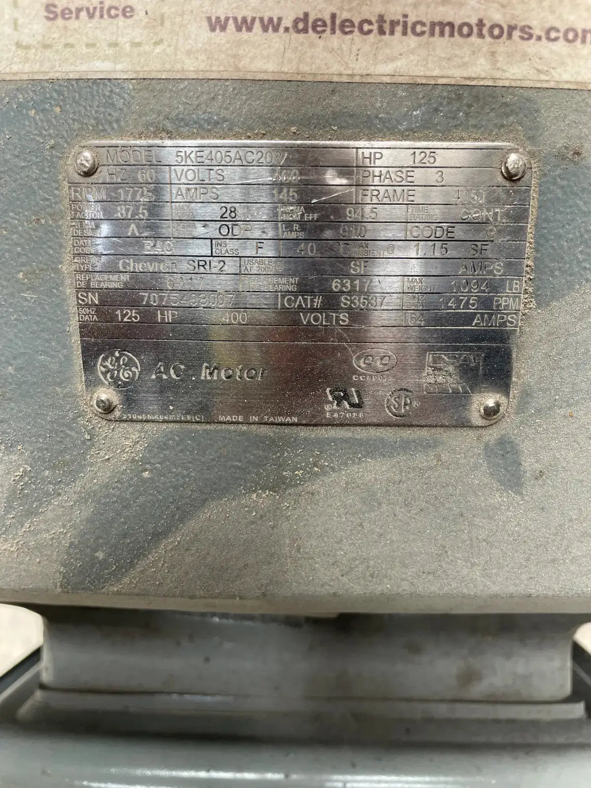 General AC Motors Electric Motor. Model: 5KE405AC208. Serial No: 7075408007. HP: 125. Hz: 60. Volts: 460. Ph: 3. Amps: 145. RPM: 1775. Frame: 405T.