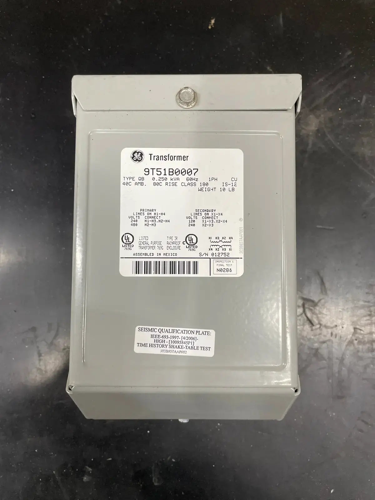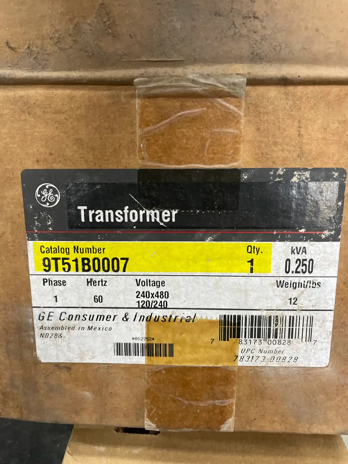 General Electric Transformer. Catalog Number: 9T51B0007. Power Rating kVA: 0.25. Ph: 1. Hz: 60. Primary Voltage: 240/480 VAC. Secondary Voltage: 120/240 VAC. Circuit Type: 8175 Frame.