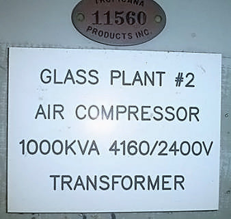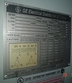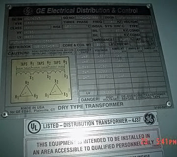 General Electric Dry-Type Step-Down Distribution Transformer- 1000 KVA. S/N: P105397. S.O: 00-11-10338. Design: AD 374W0200. Instruction book: GE 100-15. UL Listed No: 4J37. High Voltage: 4160 V. Low Voltage: 2400 V. Hertz: 60 Hz. Phase: 3 phase. Class: AA. Rise: 302 °F (150 °C). Insulation sys: 428 °F (220 °C). Vector: DD. Type: HT. Impedance: 5.67% at 338 °F (170 °C). Core and coil weight: 3860 lbs. Total unit weight: 5600 lbs. Overall dimensions: 10 ft. 7 in. L x 5 ft. W x 7 ft. 6 in. H. Originally installed at Tropicana plant.(ACN1277).