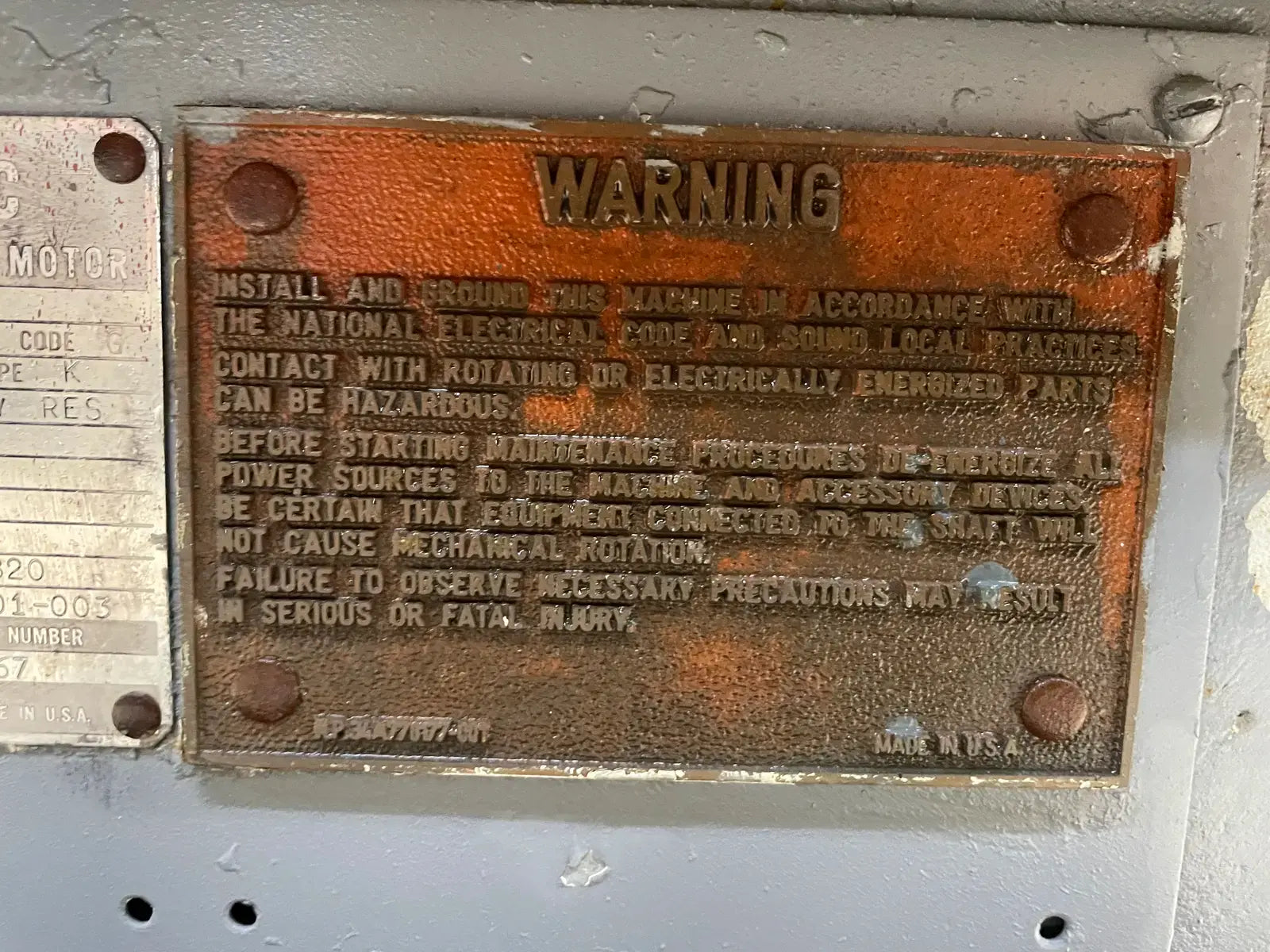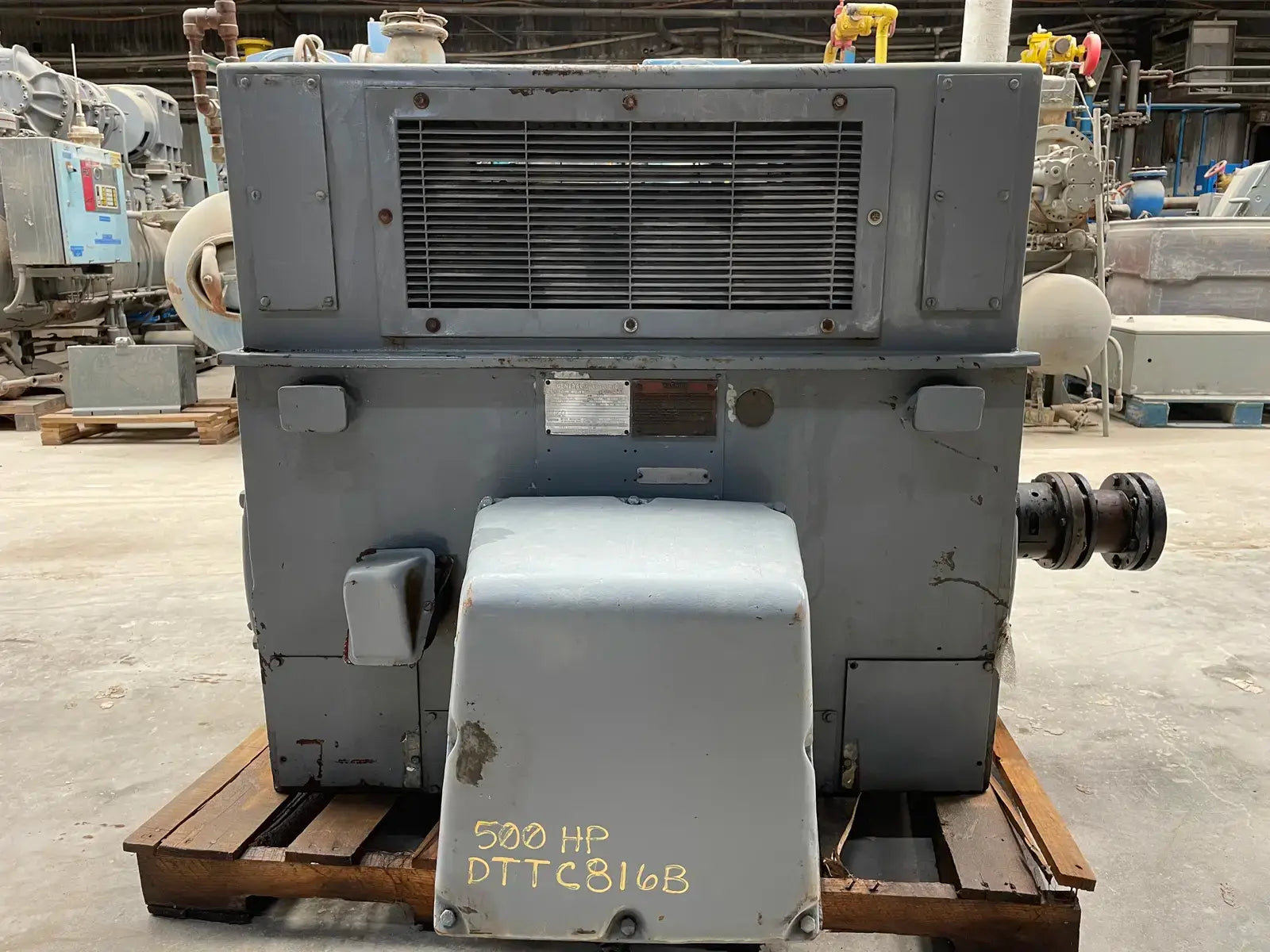 General Electric Motor- 500 HP. Model: 5K811052A158. S/N: AN8407267. 3575 rpm, 2400/4160 V, 107/62 amps, 60 Hz, 3 phase. Frame: 8110S. Type: K. Overall dimensions: 5 ft. L x 3 ft. 10 in. W x 3 ft. 4 in. H.