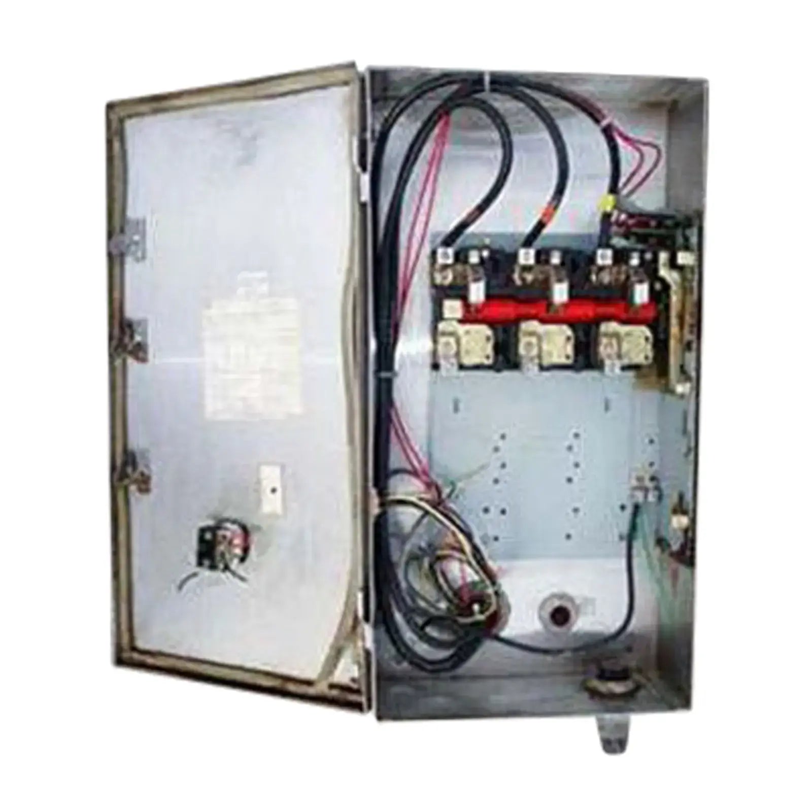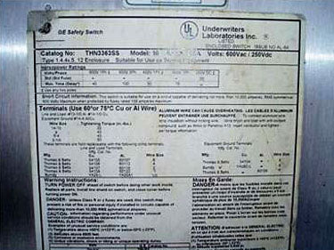 General Electric Safety Switch- 100 Amp. Model: 10. THN3363SS. Max Hp: 100. Max. power supply: 600 VAC/250 VDC. Stainless steel enclosure. Overall dimensions: 1 ft. 3 in. L x 8-1/2 in. W x 2 ft. 2 in. H.