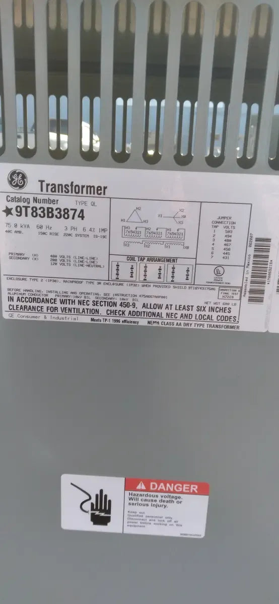 General Electric Three Phase Transformer. Catalog Number: 9T83B3874, Type: QL, kVa: 75, Hz: 60. Coil Material: Aluminum. Temperature Rise: 150.0 C. Primary Voltage: 480. Secondary Voltage: 208Y/120. Dry Type Vented.