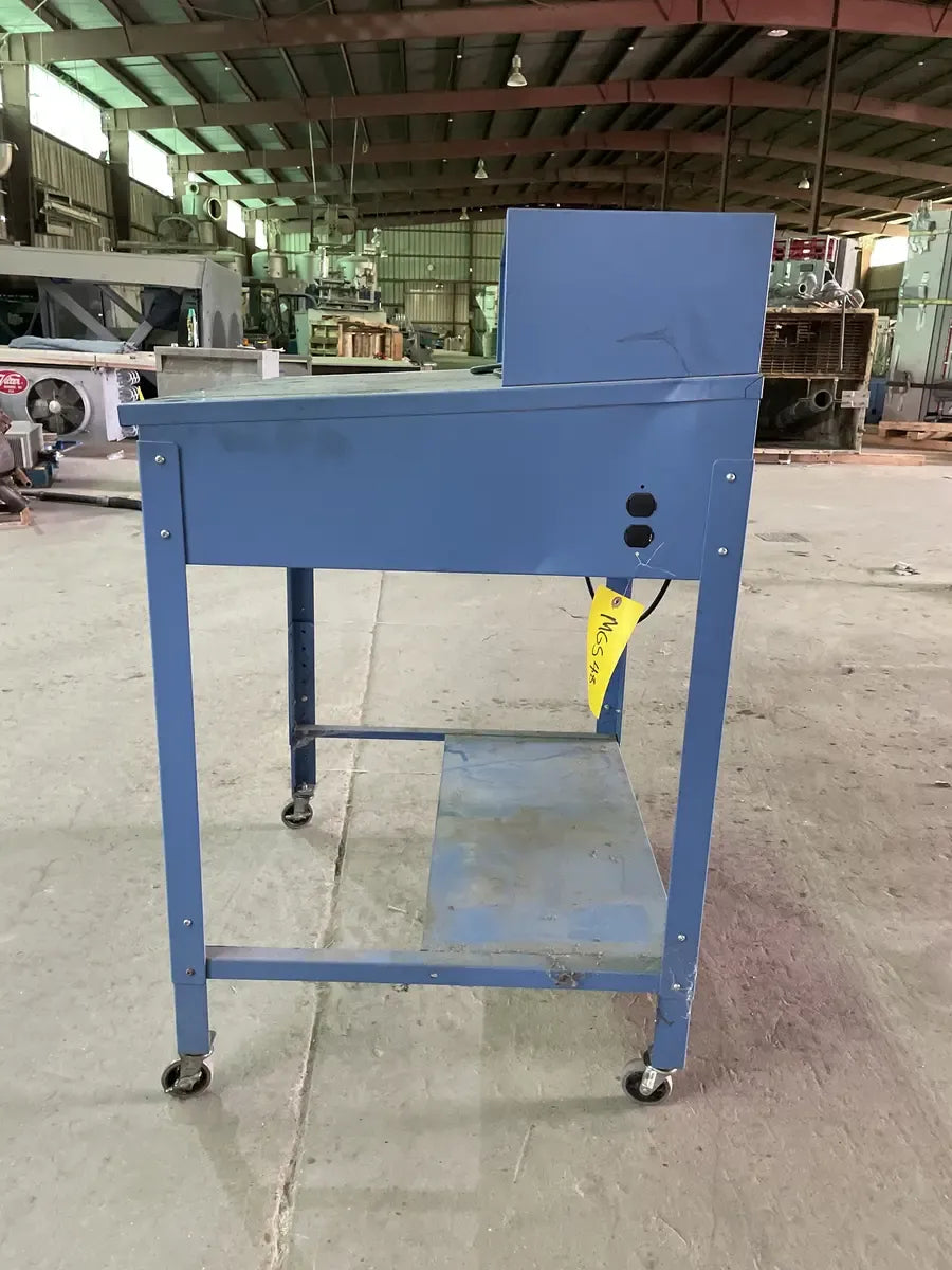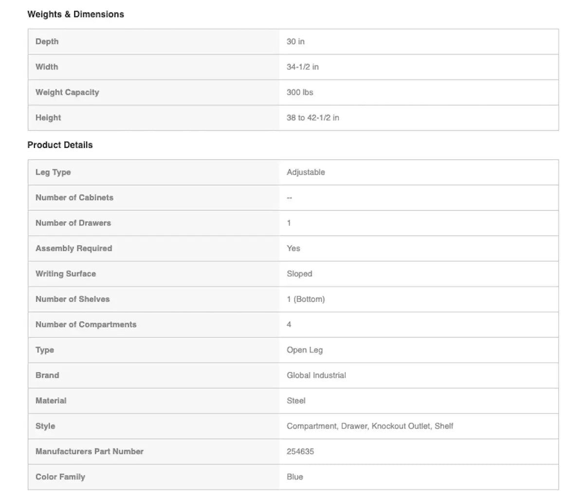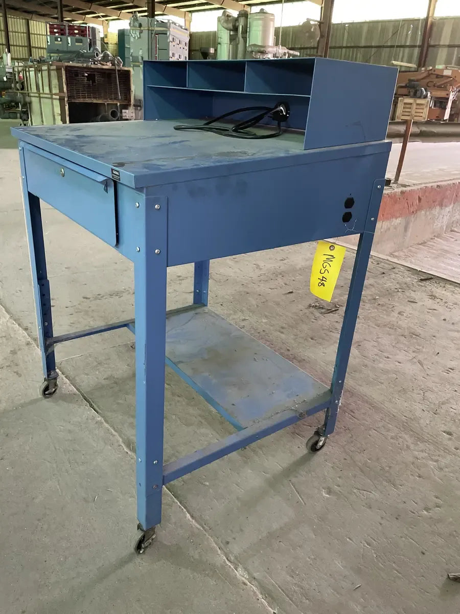 Sloped Shop Desk with wheels. Built-in Electrical Outlet for easy access. Leg type: Adjustable. The number of drawers: 1. Writing surface: Slopped. Style: Compartment Drawer, knockout-let, shelf. Overall Dimensions(in): 30 L x 34 W x 50 H.