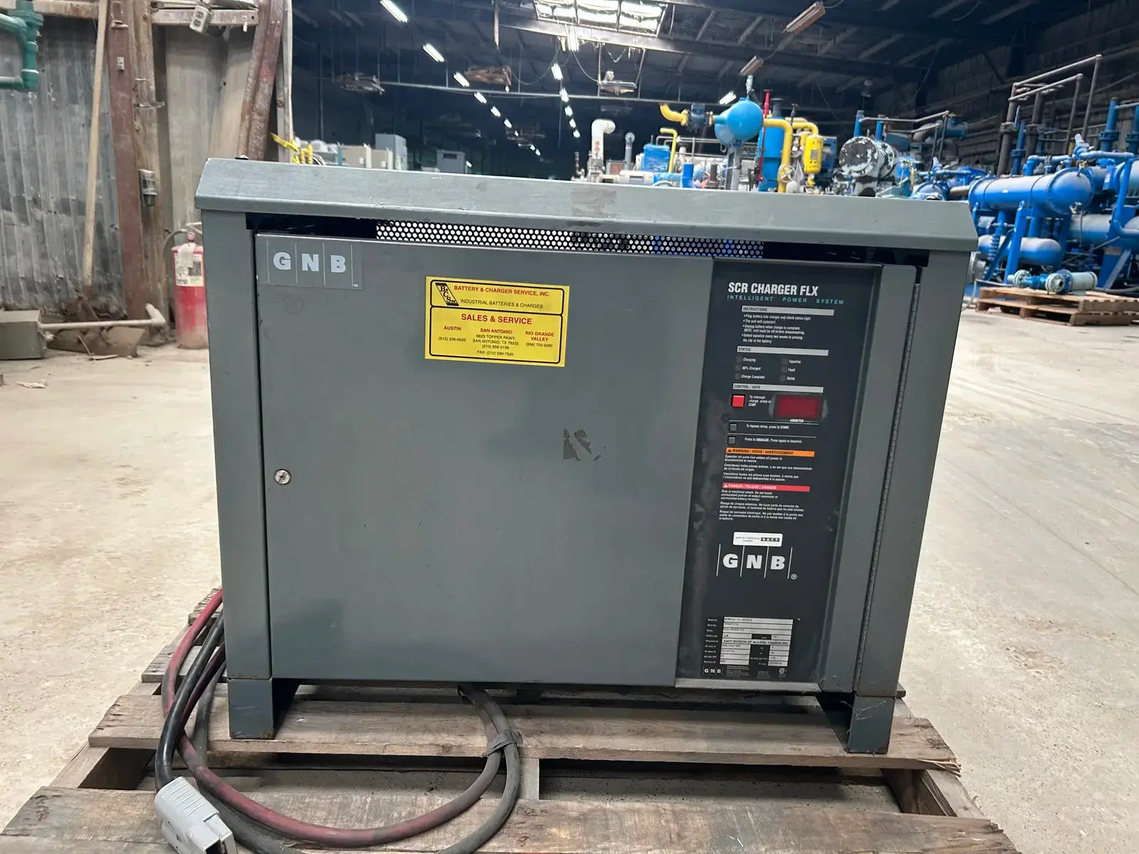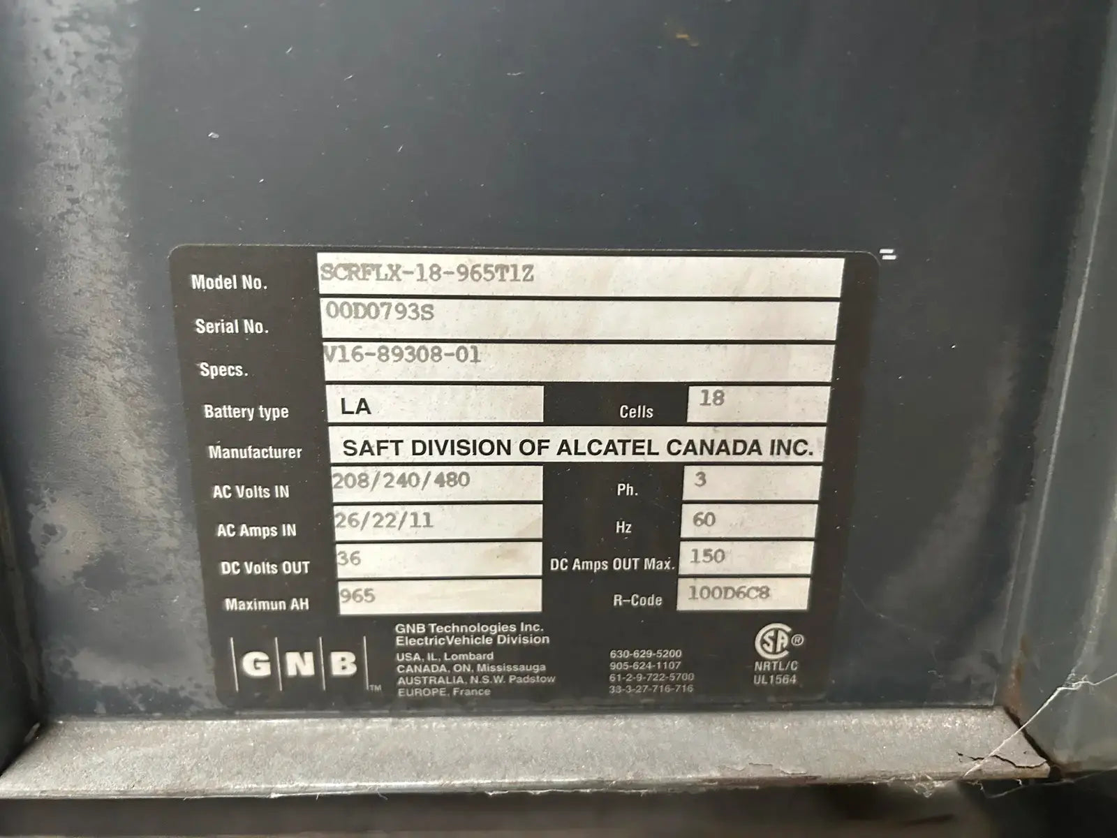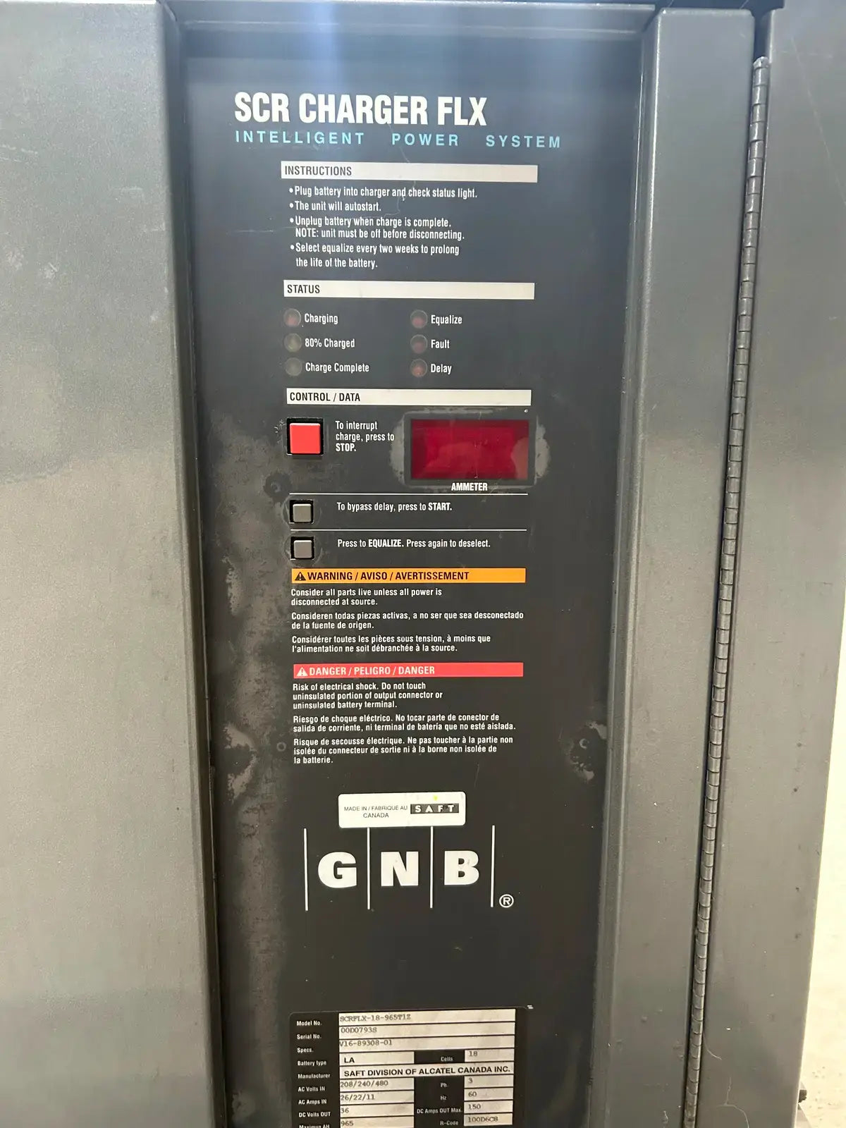 GNB Technologies Inc Battery Charger. Model: SCRFLX-18-965T1Z. Serial No: 00D0793S. Specs: V16-89308-01. Battery Type: LA. Cells: 18. AC Volts In: 208/240/480. AC Amps IN: 26/22/11. DC Volts Out: 36. Ph: 3. Hz: 60. DC Amps Out Max: 150. Maximum AH: 965.
