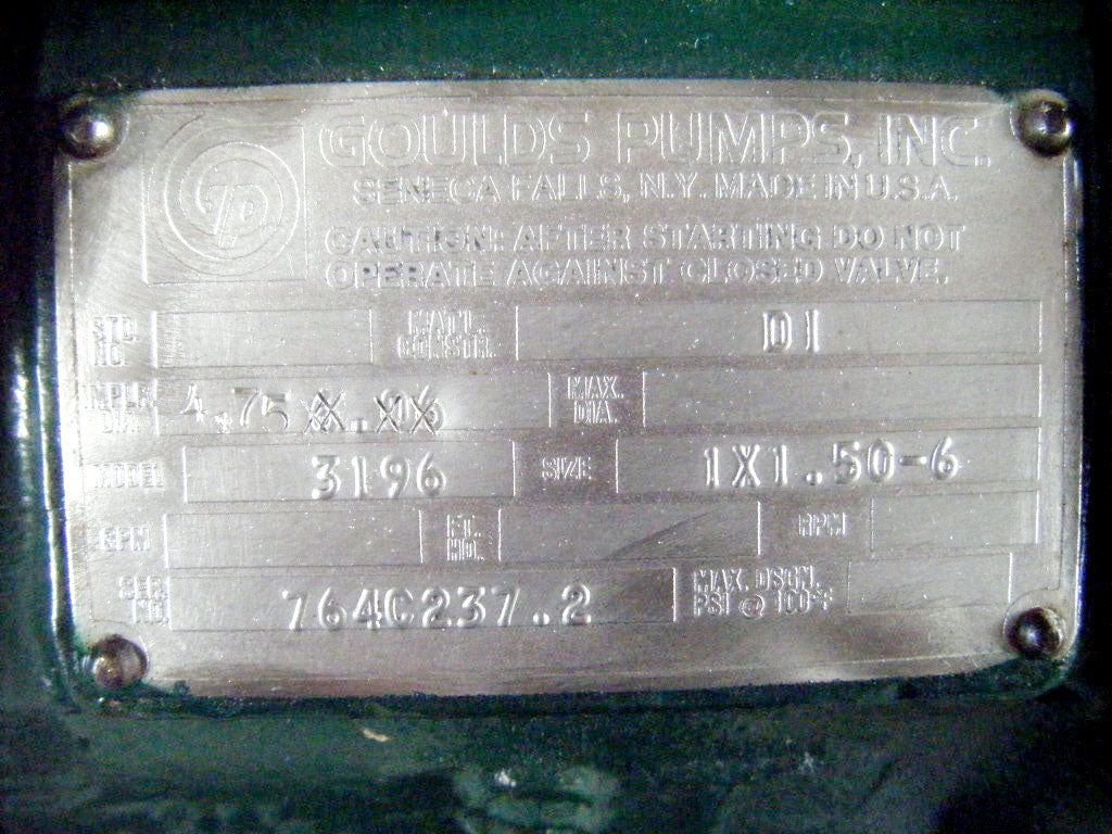 Goulds Centrifugal Pump. Model: 3196. S/N: 764C237.2. Capacity: 70 gpm @ 140 tdh (~61 psi using specific gravity of water = 1). Displacement per Revolution: 0.02 gal. Century Motor, 5 hp, 3500 rpm, 230/460 V, 13.4/6.7 amps, 60 Hz, 3 phase. 6 in. cavity for impeller. 5 in. impeller diameter. This pump has a fully open impeller, external impeller adjuster, and back pull-out design. Can be used in chemical, petrochemical, pulp, paper, primary metals, food & beverage. Inlets: (1) 1 ½ in. dia. port with a 5 in. flange and (4) ½ in. bolt holes. Outlets: 1 in. dia. port with a 4 ½ in. flange and (4) ½ in. bolt holes. Overall dimensions: 3 ft. 7 in. L x 1ft. 2 in. W x 1 ft. 10 in. H.