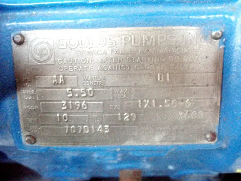Goulds Centrifugal Pump. Model: 3196. Size: 1x1.50-6. Flow rate for new pump is 150 gpm with required horsepower and pressure. Discuss with salesperson your process and product to determine if this pump should handle your specific duty. Impeller diameter: 5.50 in. Maximum speed: 3600 rpm. Weg Motor, 7.5 hp. The 3196 pump is a horizontal overhung, open impeller, centrifugal pump that meets the requirements of ANSI B73.1. Inlets: (1) 1-1/2 in. dia. suction ANSI flat-faced flange. Outlets: (1) 1 in. dia. discharge ANSI flat-faced flange. Overall dimensions: 3 ft. 2-5/8 in. L x 1 ft. 2 in. W x 1 ft. 4 in. H.(ACN71).