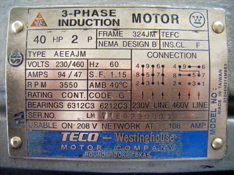 - Motor Manufacturer: TECO Electric and Machinery Co.