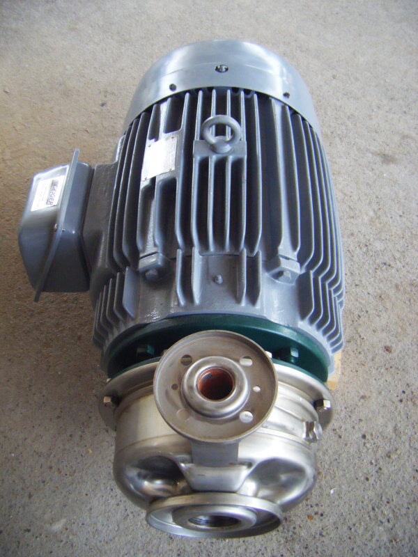 Goulds G&L Series SST Centrifugal Pump. Flow rate for new pump is 250 gpm with required horsepower and pressure. Discuss with salesperson your process and product to determine if this pump should handle your specific duty. Teco-Westinghouse motor 40 Hp, 3550 rpm, 230/460 volts, 94/47 amps, 60 Hz, 3 phase. Inlet: (1) 3-5/8 in. dia. flange. 4 mounting holes 7/8 in. dia. 4-1/8 in. adjacent 5-1/2 opposite. Outlet: (1) 1-1/2 in. flange. 4 mounting holes 5/8 in. dia. 3-3/4 in. adjacent 3-7/8 in. opposite. Overall dimensions: 2 ft. 9-3/4 in. L. x 1 ft. 10 in. W. x 1 ft. 7-1/2 in. H.(ACN50).