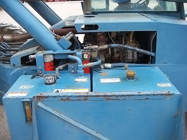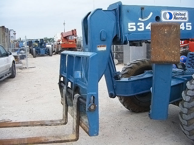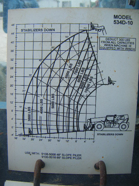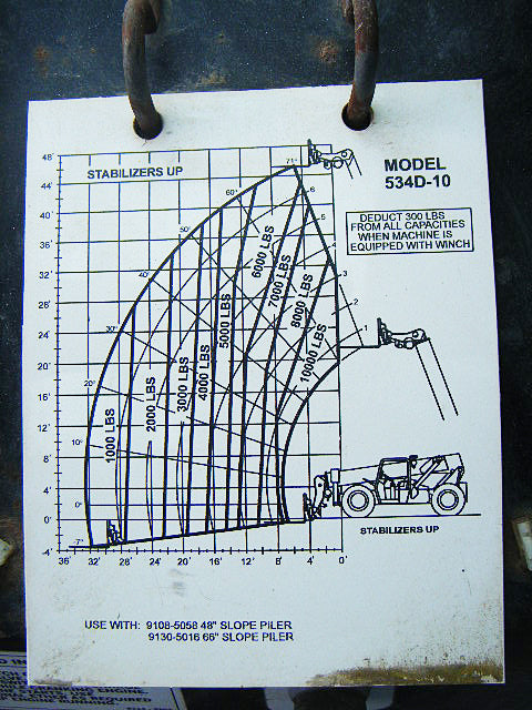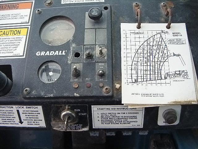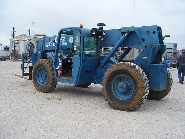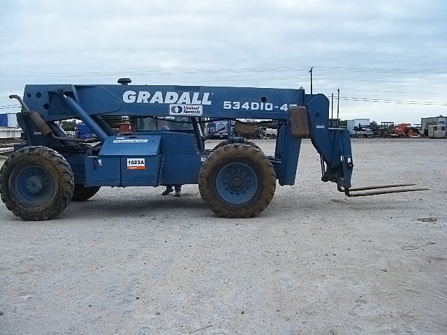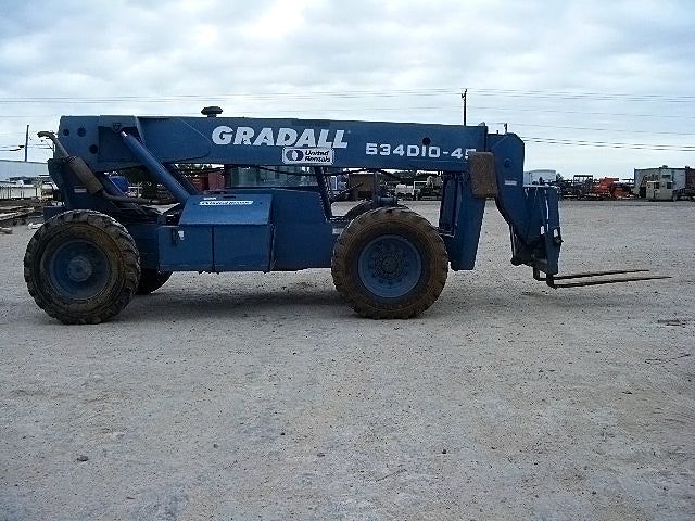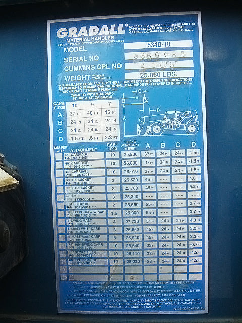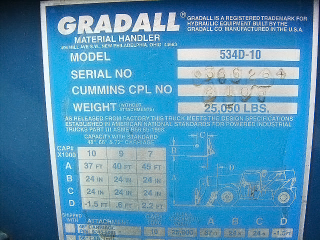 2000 Gradall 4x4 Telescopic Telehandler Forklift. Model: 534d10-45. Rated capacity: 10,000 lbs. Maximum extension: 31.6 ft. Maximum lift height: 45 ft. Capacity at maximum extension: 1600 lbs. Engine: Cummins 115 hp, 4 cylinder, diesel. Features: (3) section boom, outriggers, hydraulic leveling, and foam filled tires. Tire size: 14.00-24. Overall dimensions (fully retracted) 24 ft. 8 in. L x 8 ft. W x 8 ft. 2 in. H. Hour meter reading: 7289.(ACN111a).