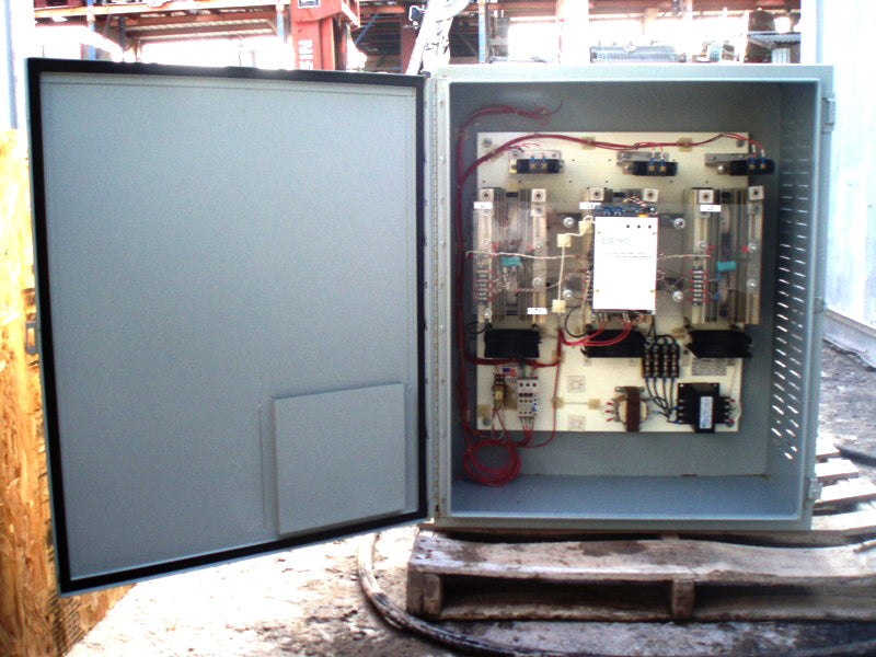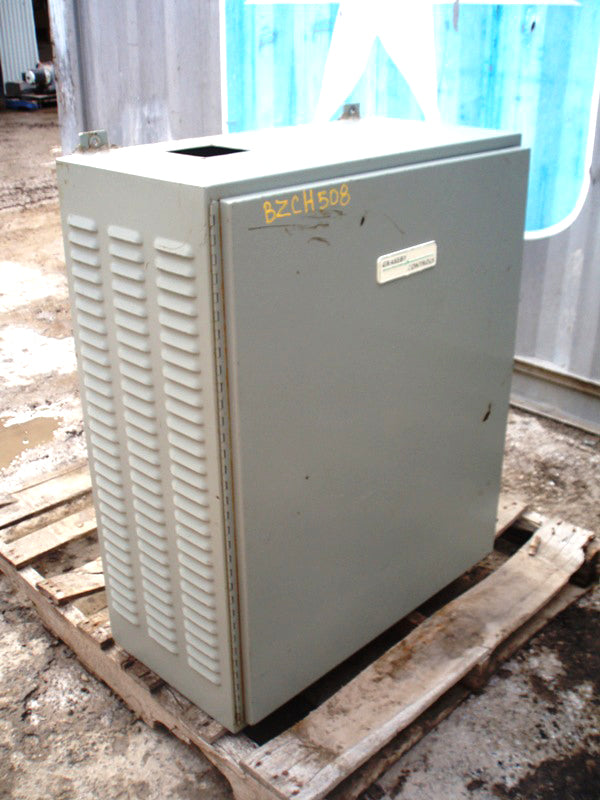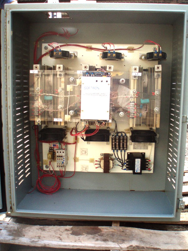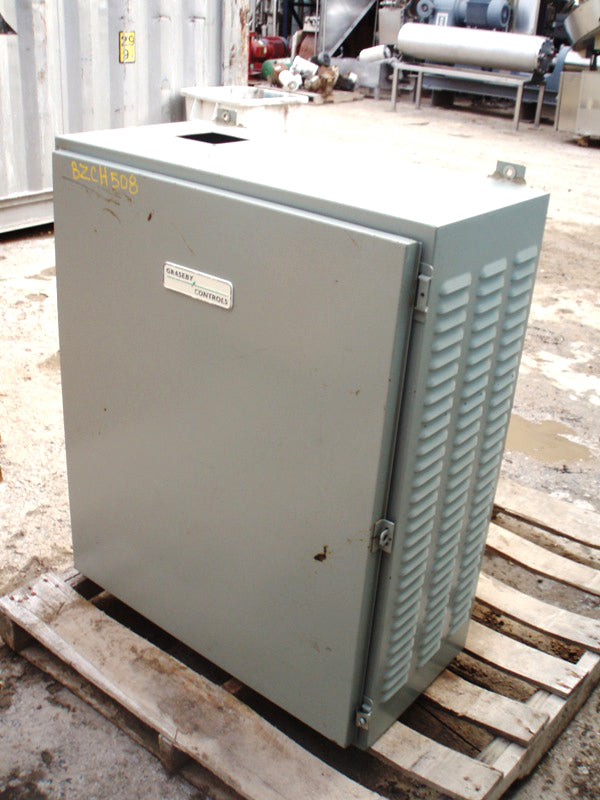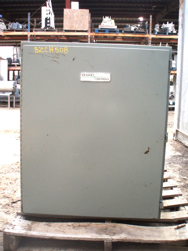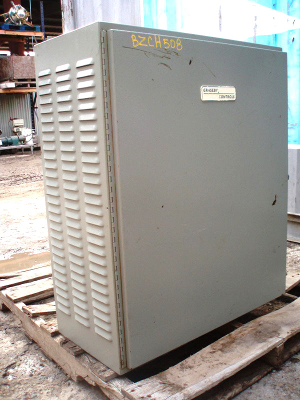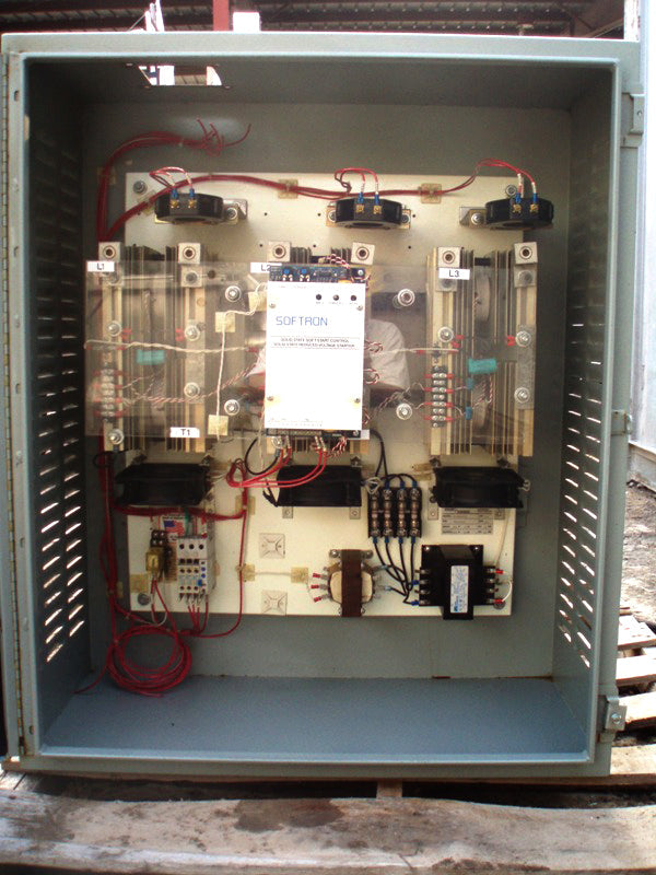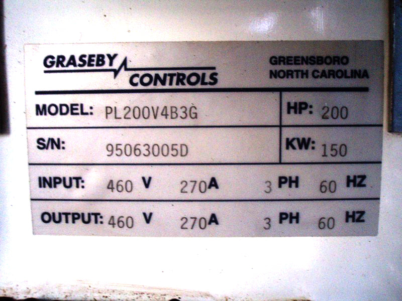Graseby Soft Start Motor Starter – 200 HP. Model: PL200V4B3G. S/N: 95063005D. Input: 460 V, 270 amps, 60 Hz, 3 phase. Output: 460 V, 270 amps, 60 Hz, 3 phase, 150 KW. Overall dimensions: 2 ft. 6-1/4 in. L x 1 ft. 3 in. W x 3 ft. 2 in. H.