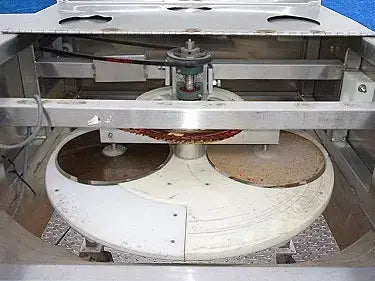 Griffin Stainless Steel Slicer. Unit uses (2) 13 in. circular, rotating cutting knives to cut product. There exists a 1/4 in. gap between cutting knives and the 33 in. dia rotating table. Industry Uniserve Univerter 2 HP AC Inverter Drive, input: 208-230 V, 7.5 amps, 50/60 Hz, 3 phase, output: 3.5-230 V, 7.5 amps. Positions easily by rolling on (4) casters. Baldor Industrial Motor, 3/4 hp, 1725 rpm, 230/460 V, 2.2/1.1 amps, 60 Hz, 3 phase. Ohio Gear Drive, 40 ratio, 43.125 rpm (final). Inlets: (1) 2-1/2 in. W x 3 in. H oval infeed, (3) 6 in. dia. ports. Outlets: (1) 36 in. L x 36 in. W. Overall dimensions: 59-1/2 in. L x 55 in. W x 60 in. H.