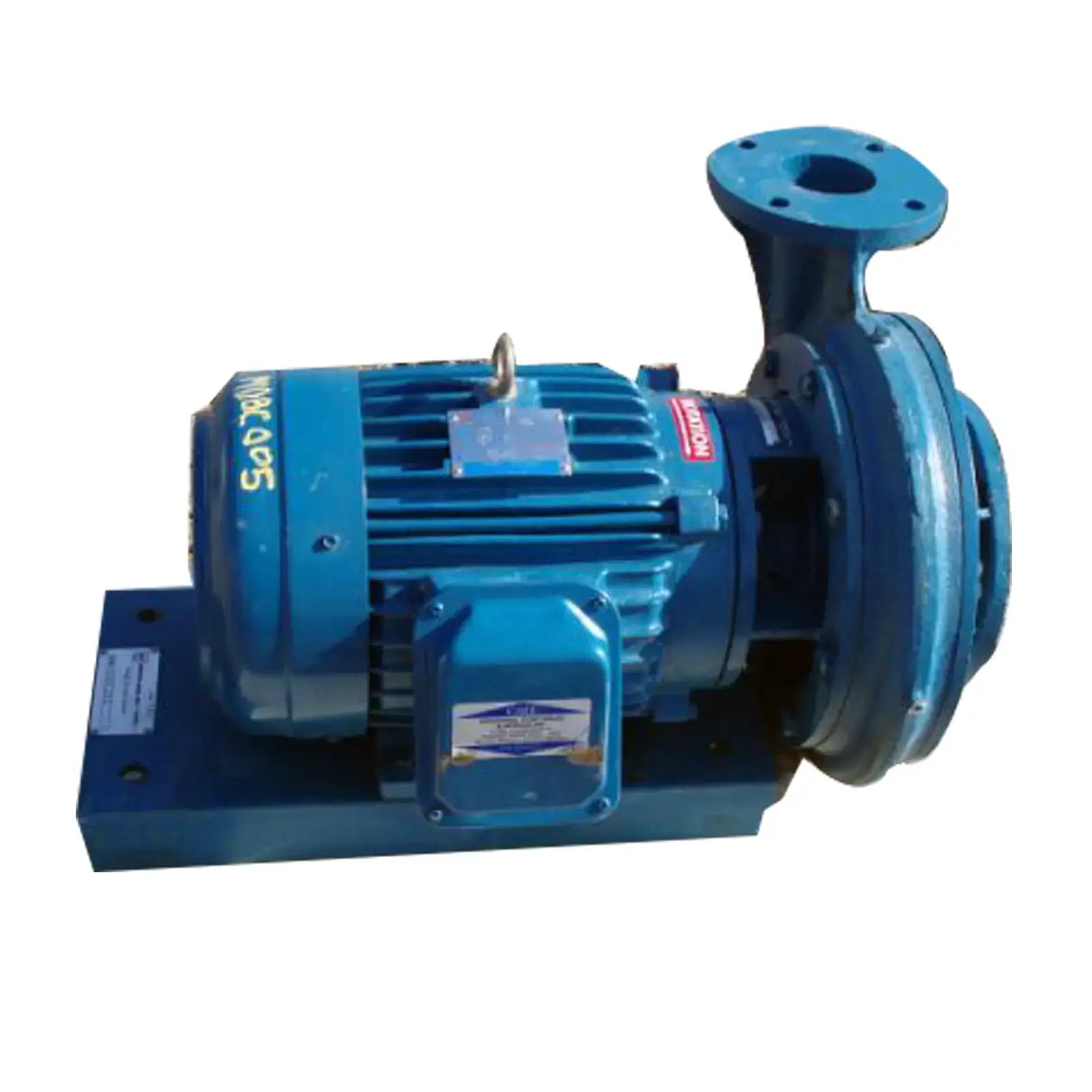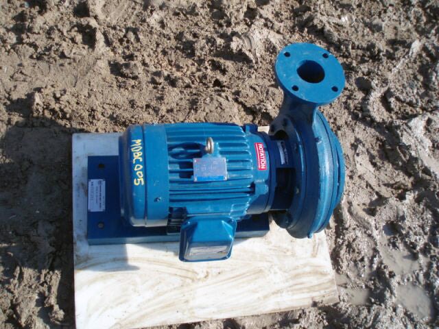 Griswold Centrifugal Circulating Pump. Model: R3EM75ST- G37099. Flow rate for new pump is 225 gpm with required horsepower and pressure. Discuss with salesperson your process and product to determine if this pump should handle your specific duty. Westinghouse electric motor, 7-1/2 hp. Inlet: (1) 4 in. dia. flanged port. Outlet: (1) 3 in. dia. flanged port. Overall dimensions: 2 ft. 3 in. L x 1 ft. 9 in. W x 1 ft. 4 in. H.(H9)(ACN24)
