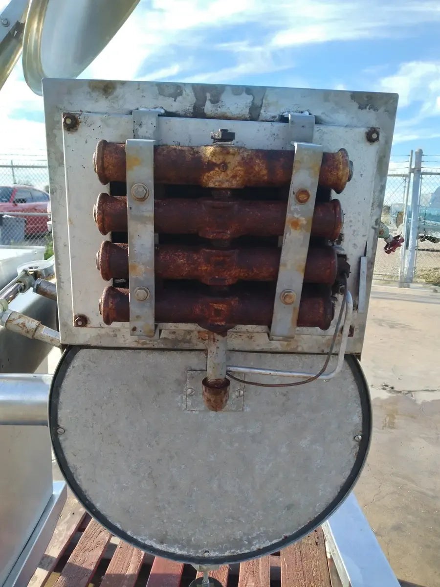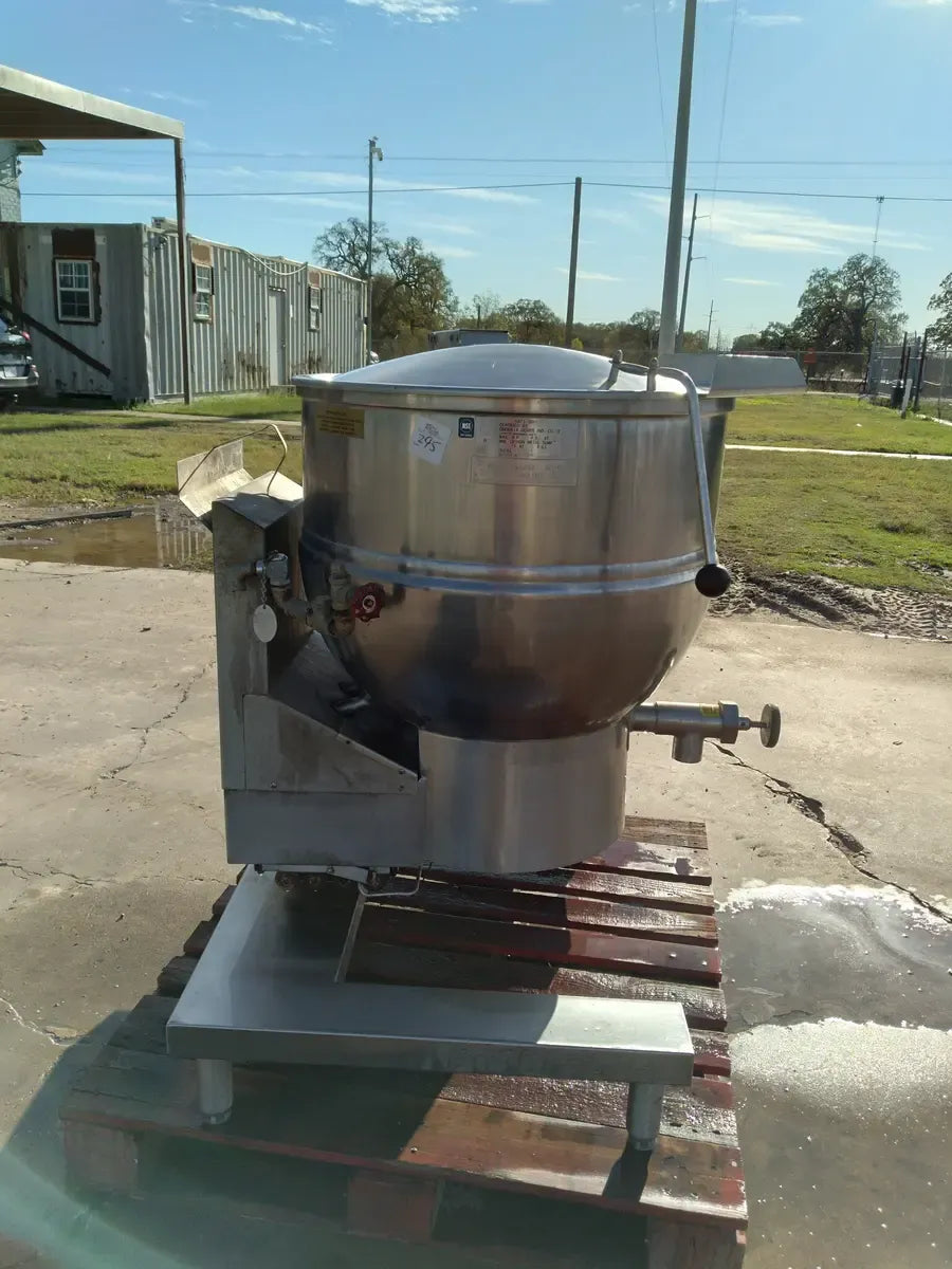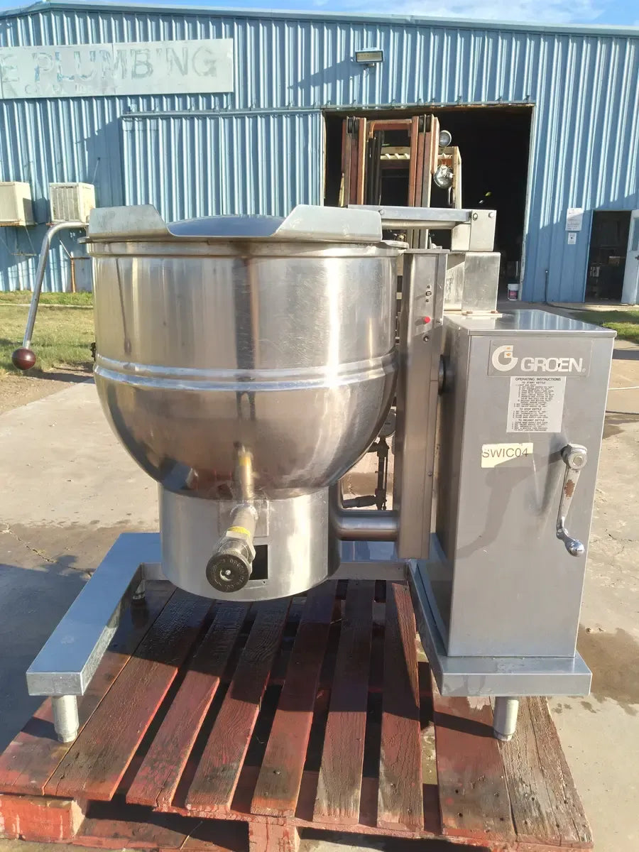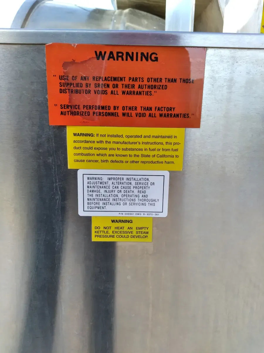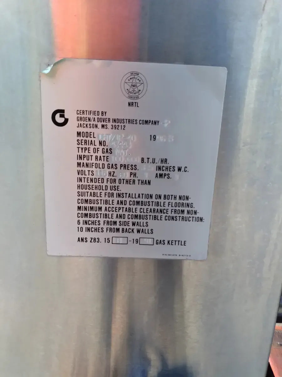 Certified By Groen:A Dover Industries Company Jackson, MS. 39212 1996-3, Model:DHT/1P-40, Serial No: 43443. Type Of Gas: NAT, Input Rate: 100.000 B.T.U./HR, Manifold Gas Press: 3.5 Inches W.C. Volts: 115, Hz: 60, PH: 1, Amps: 1. Intend for other than household use. Suitable for installation on both Non Combustible and Combustible Flooring. Minimum Acceptable Clearance from Non Combustible and Combustible. Construction: 6 Inches From Side Walls, 10''In From Back Walls. •ANS Z83. 15: B -19, 91 Gas Kettle.