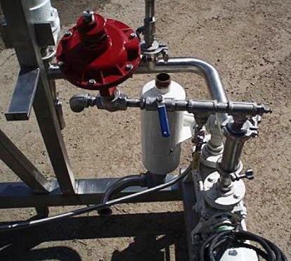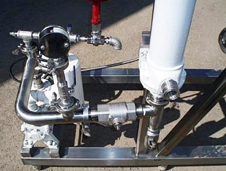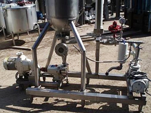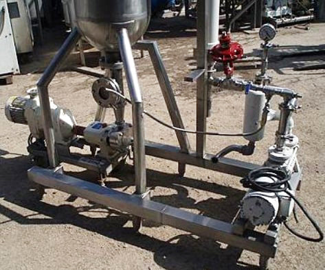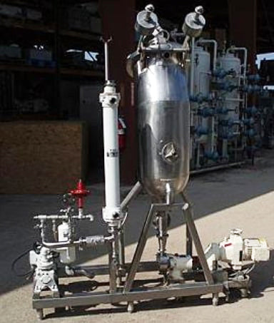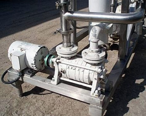 Groen Vacuum System. Previously used as a deodorizer. Model: Flash Chamber. S/N: 83196. MAWP: 50 psi. Groen Vertical Separator- 20 Gallon, inside straight-wall dimensions: 1 ft. 5 in. dia. x 1 ft. 9 in. H, CIP sprayball-equipped. Inlets: (1) 2 in. dia. S-line fitting. Outlets: (1) 1-1/2 in. dia. S-line fittings. Media: (1) 1 in. dia. S-line fittings. Ametek shell and tube condenser. G&H positive displacement recirculation pump. 2 HP vacuum pump. Overall dimensions: 6 ft. 6 in. L x 2 ft. 6-1/2 in. W. 8 ft. 3 in. H.