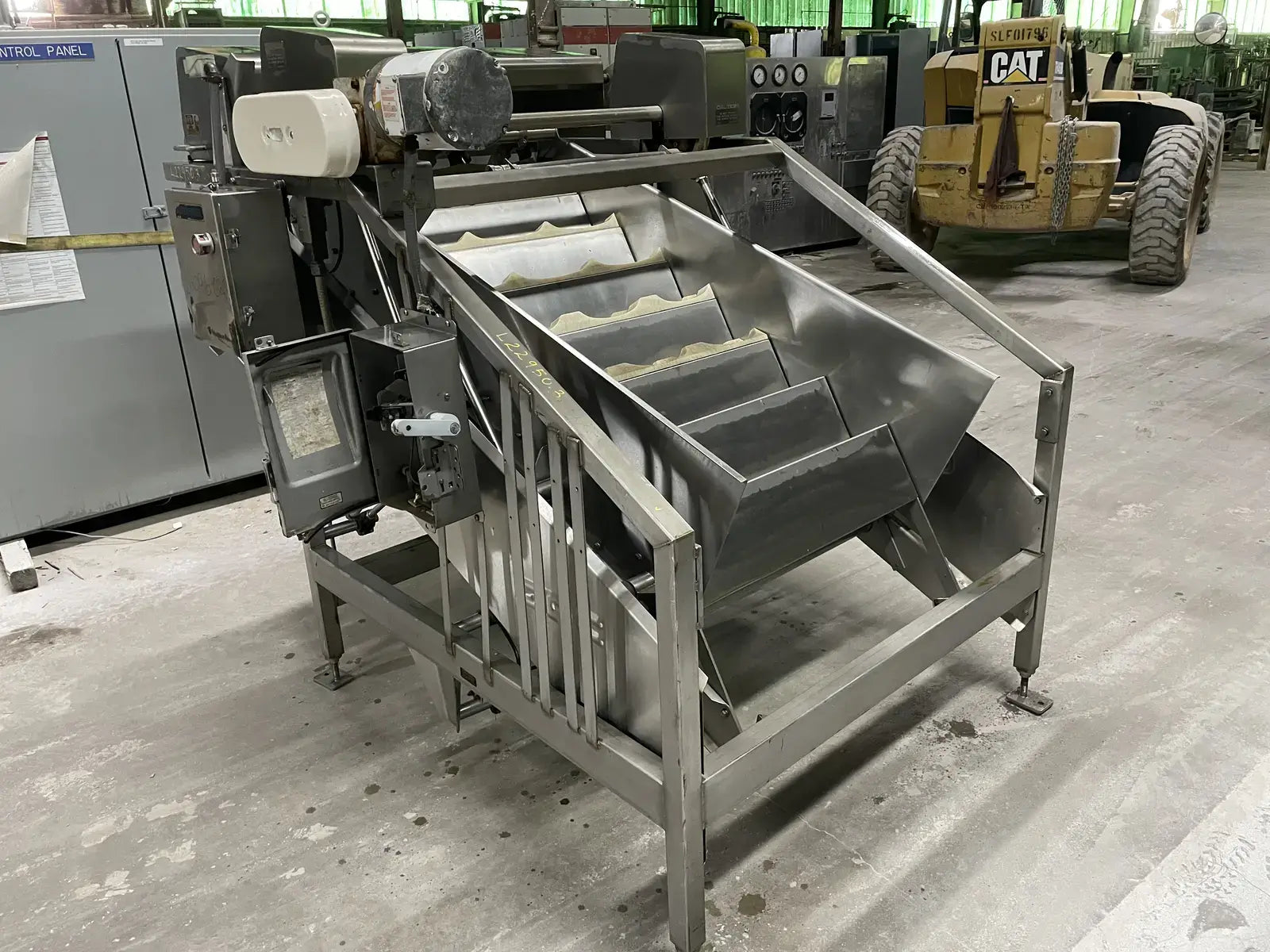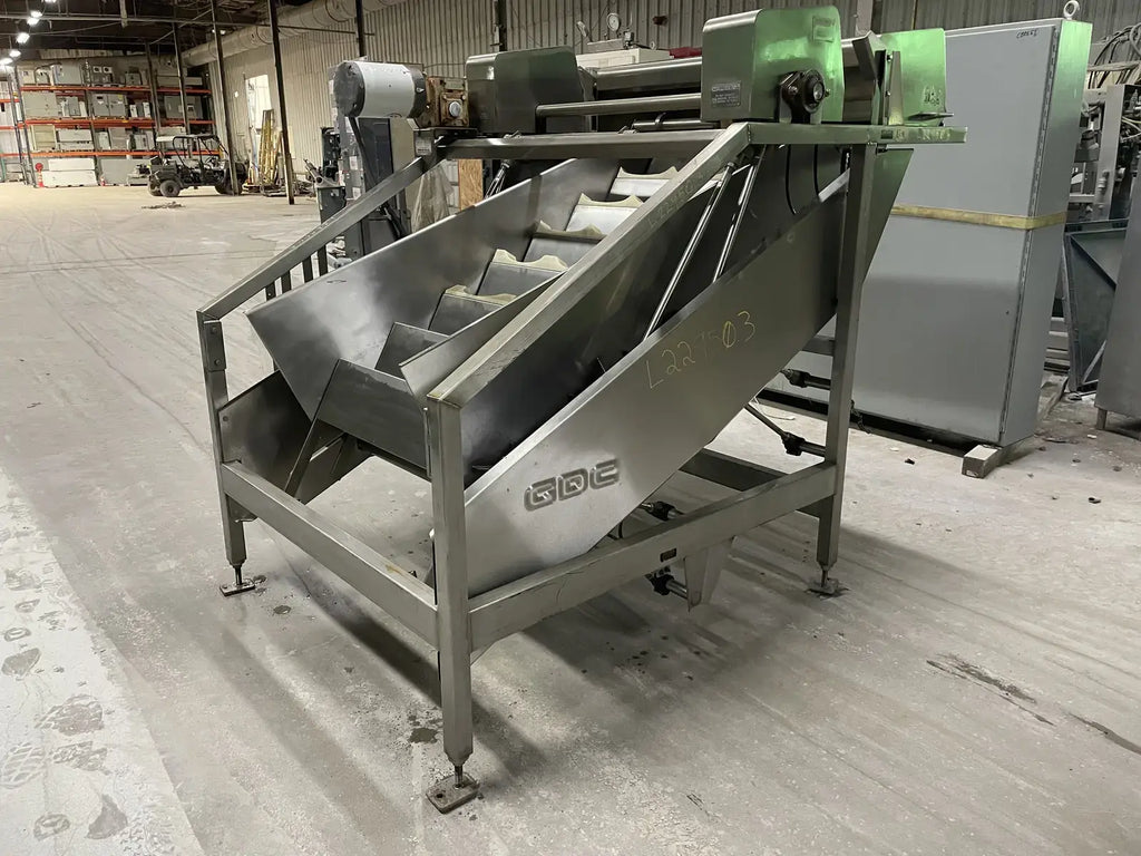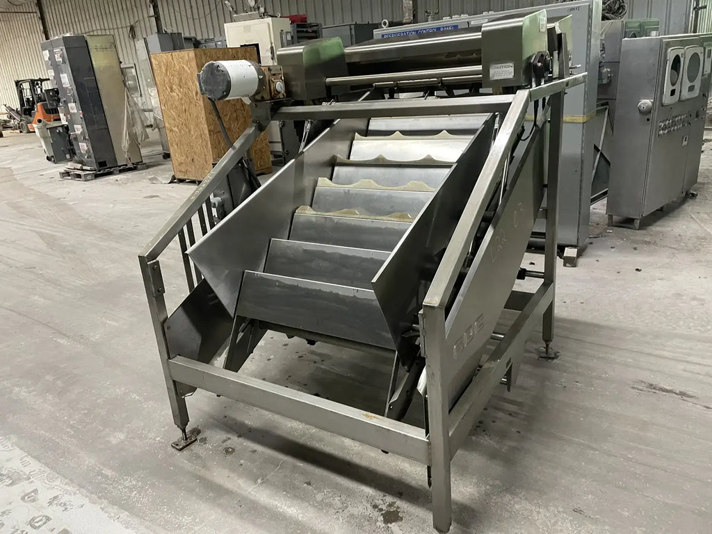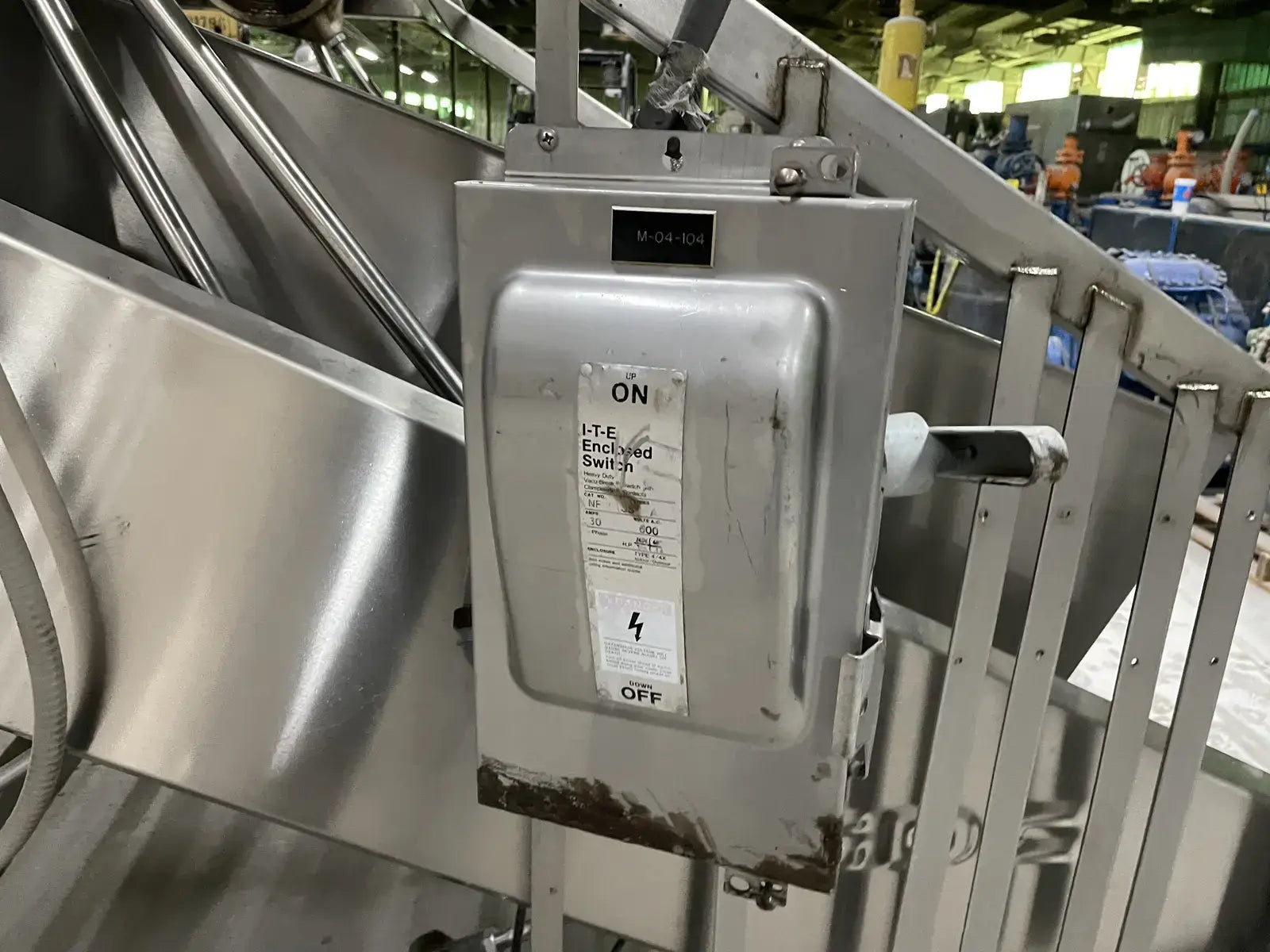 Grove Dale CenCut Auto Halver Series FC15. Model: C18 – E6027 - 33U30. S/N: 5863. Stainless steel T304. I-T-E Enclosed Switch, 600 V, 30 amps, 3 phase. Inclined feed area 33 in. W x 69 in. L, 7 in. to base adjustable, Baldor Motor, 1 hp, 1725 rpm, 208-230/460 V, 3.5-3.2/1.6 amps, 60 Hz, 3 phase. Infeed: 34 in. H, Exit: 55 in. H. Overall dimensions: 84 in. L x 62 in. W x 72 in. H.(H17)(ACN650).