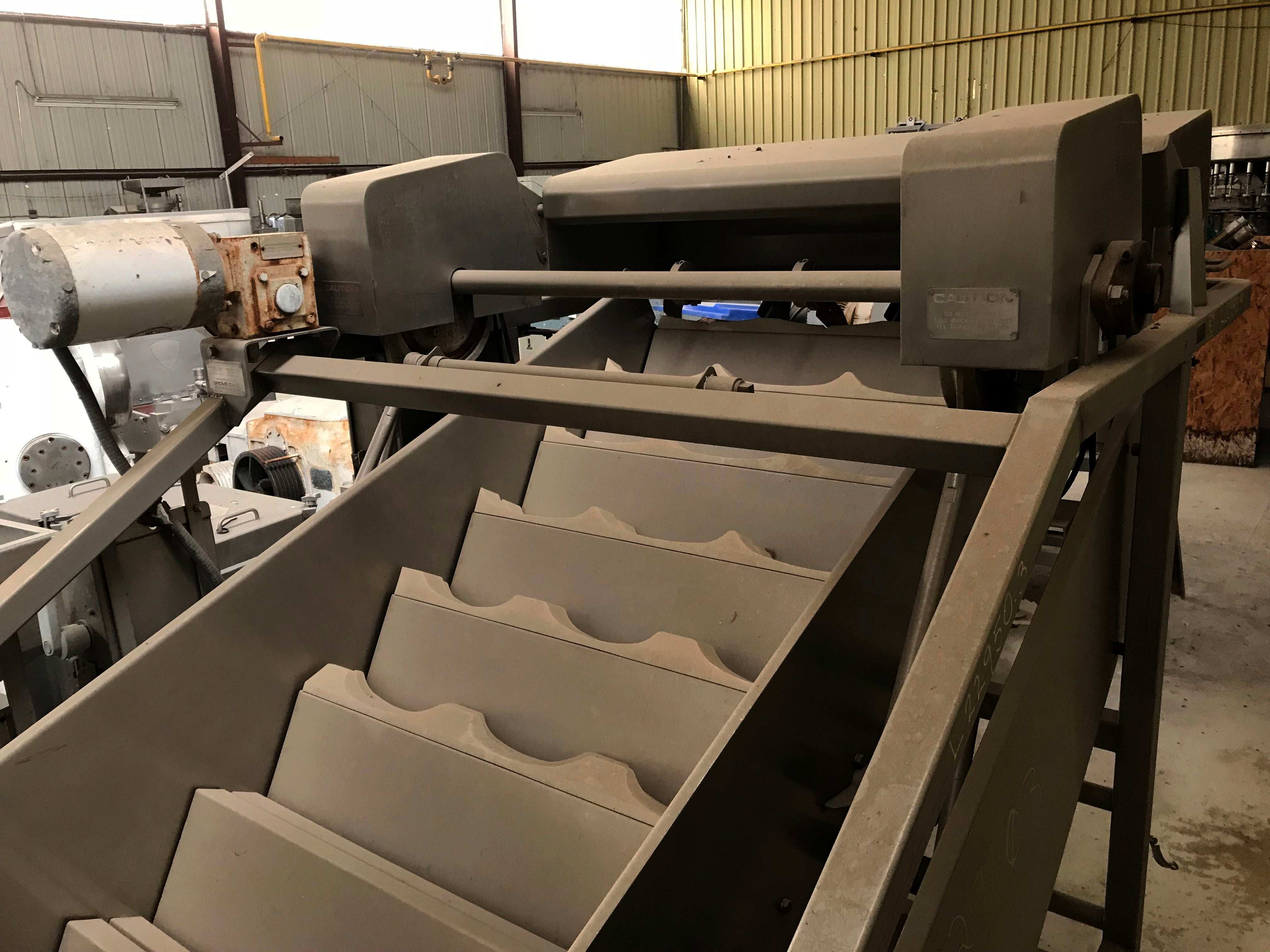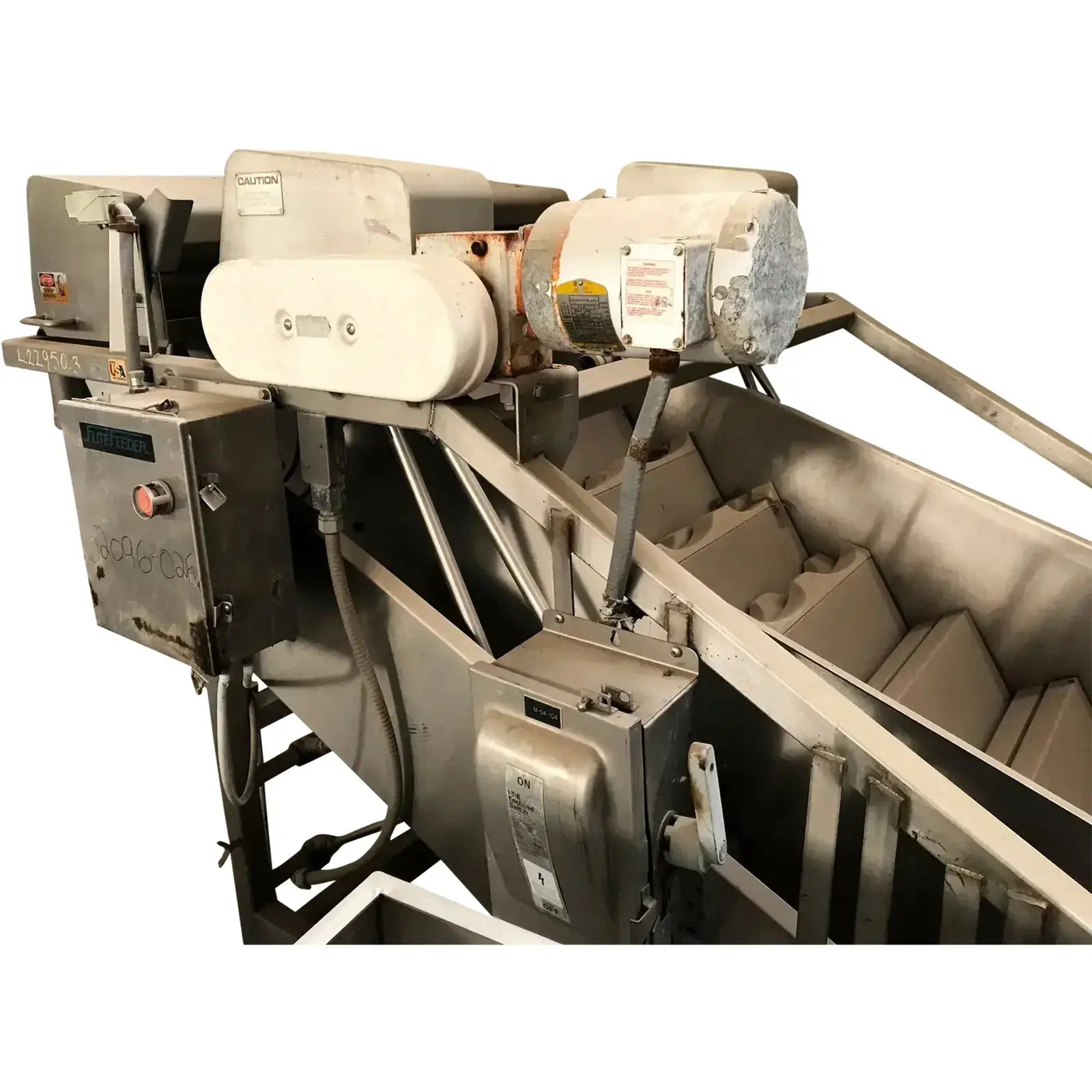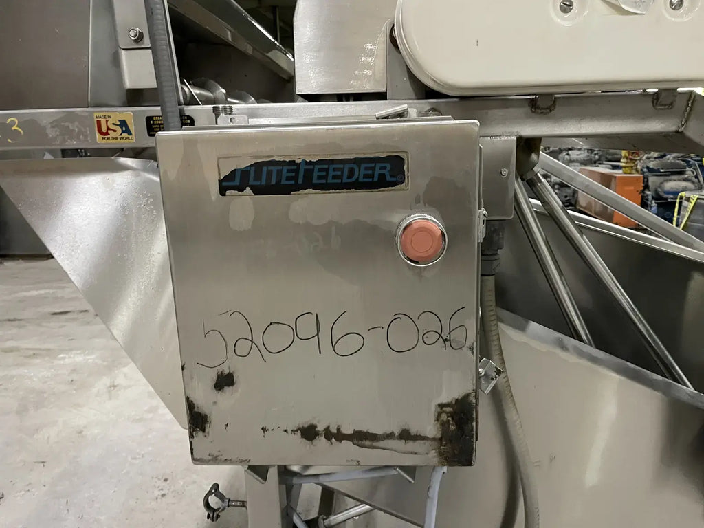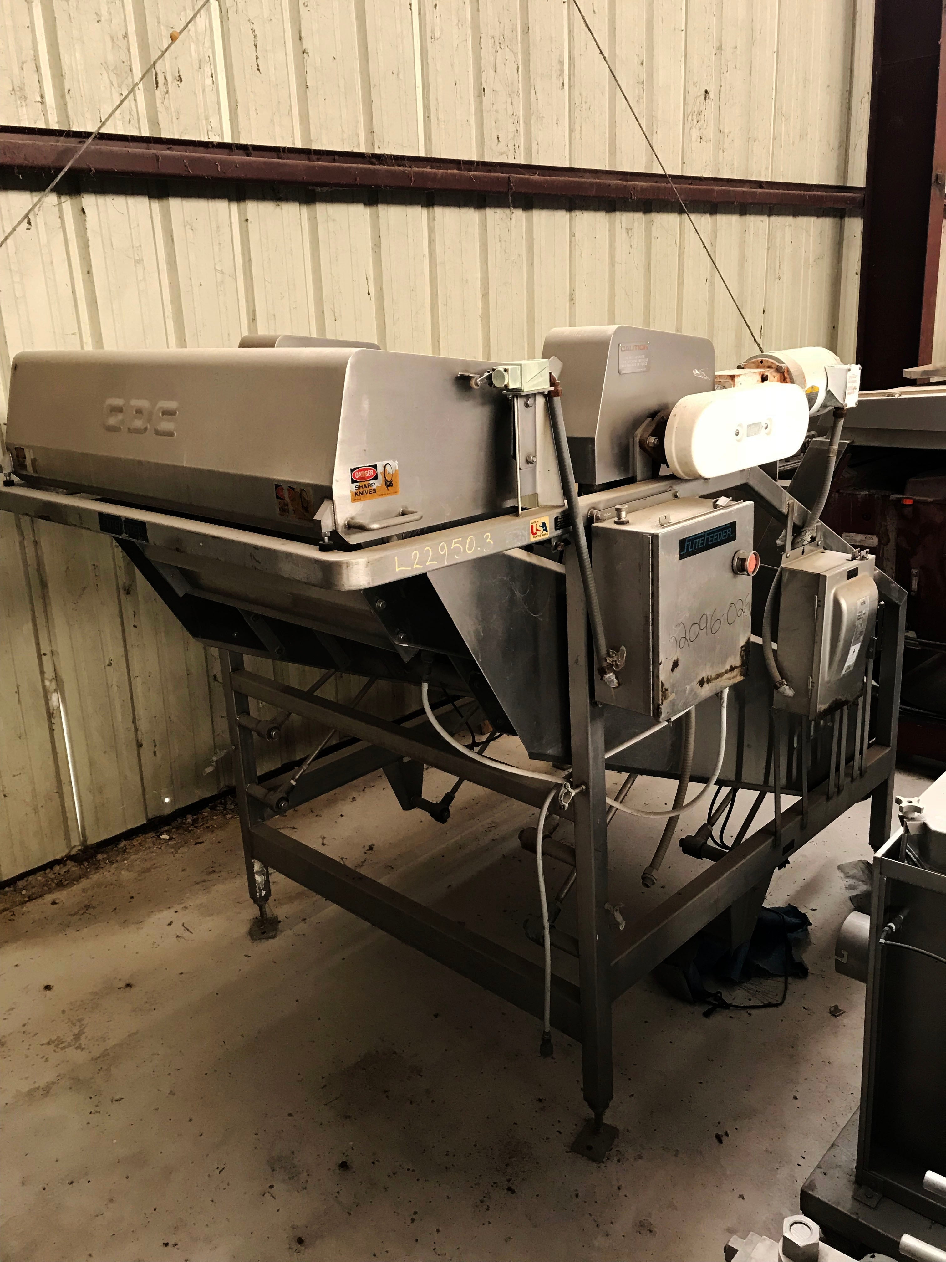 Grove Dale CenCut Auto Halver Series FC15. Model: C18 – E6027 - 33U30. S/N: 5863. Stainless steel T304. I-T-E Enclosed Switch, 600 V, 30 amps, 3 phase. Inclined feed area 33 in. W x 69 in. L, 7 in. to base adjustable, Baldor Motor, 1 hp, 1725 rpm, 208-230/460 V, 3.5-3.2/1.6 amps, 60 Hz, 3 phase. Infeed: 34 in. H, Exit: 55 in. H. Overall dimensions: 84 in. L x 62 in. W x 72 in. H.(H17)(ACN650).
