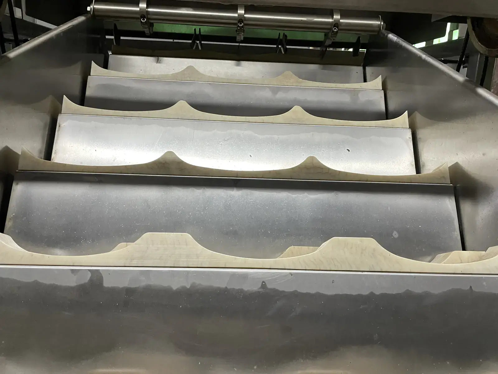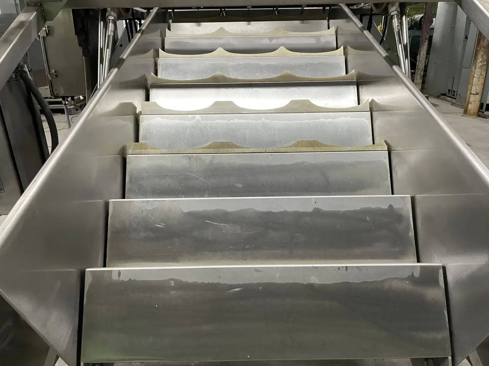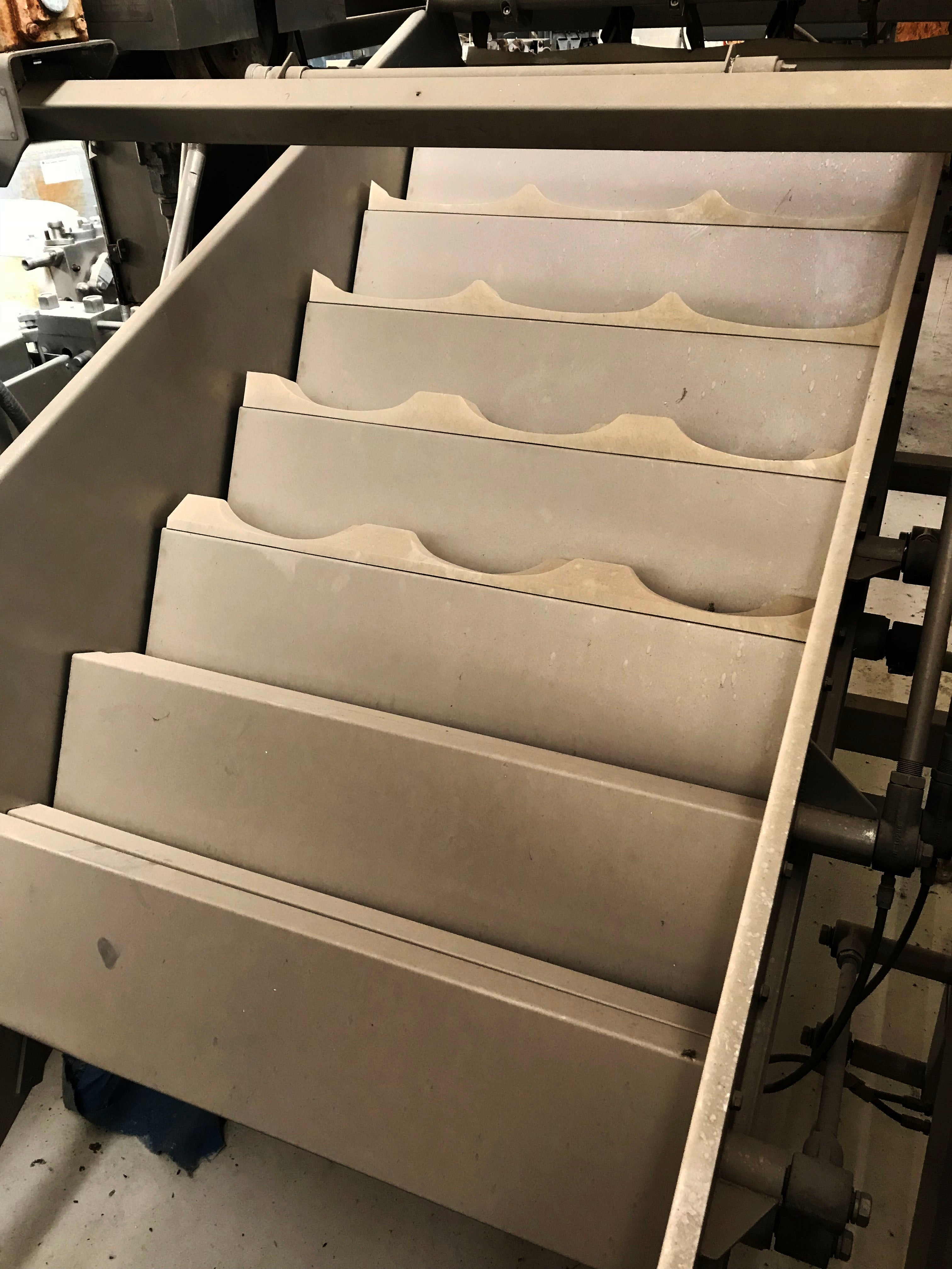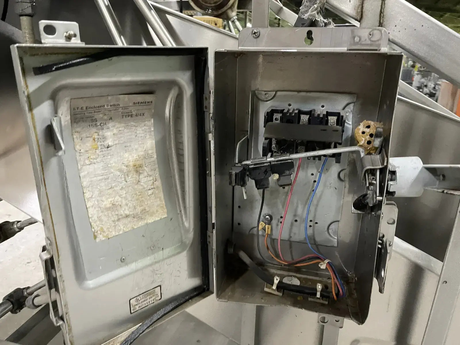 Grove Dale CenCut Auto Halver Series FC15. Model: C18 – E6027 - 33U30. S/N: 5863. Stainless steel T304. I-T-E Enclosed Switch, 600 V, 30 amps, 3 phase. Inclined feed area 33 in. W x 69 in. L, 7 in. to base adjustable, Baldor Motor, 1 hp, 1725 rpm, 208-230/460 V, 3.5-3.2/1.6 amps, 60 Hz, 3 phase. Infeed: 34 in. H, Exit: 55 in. H. Overall dimensions: 84 in. L x 62 in. W x 72 in. H.(H17)(ACN650).