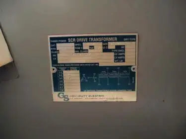 GS Hevi-Duty Electric 118 KVA SCR Drive Transformer. S/N: 203526. Specification: 0451522T00. Dry-type transformer. Percent impedance @ 338 °F: 5.2. Class: AA. Electrical requirements: 380 V (high), 460/266 V (low), 179 amps (high), 148 amps (low). Overall dimensions: 33 in. L x 21 in. W x 44 in. H.(H17).