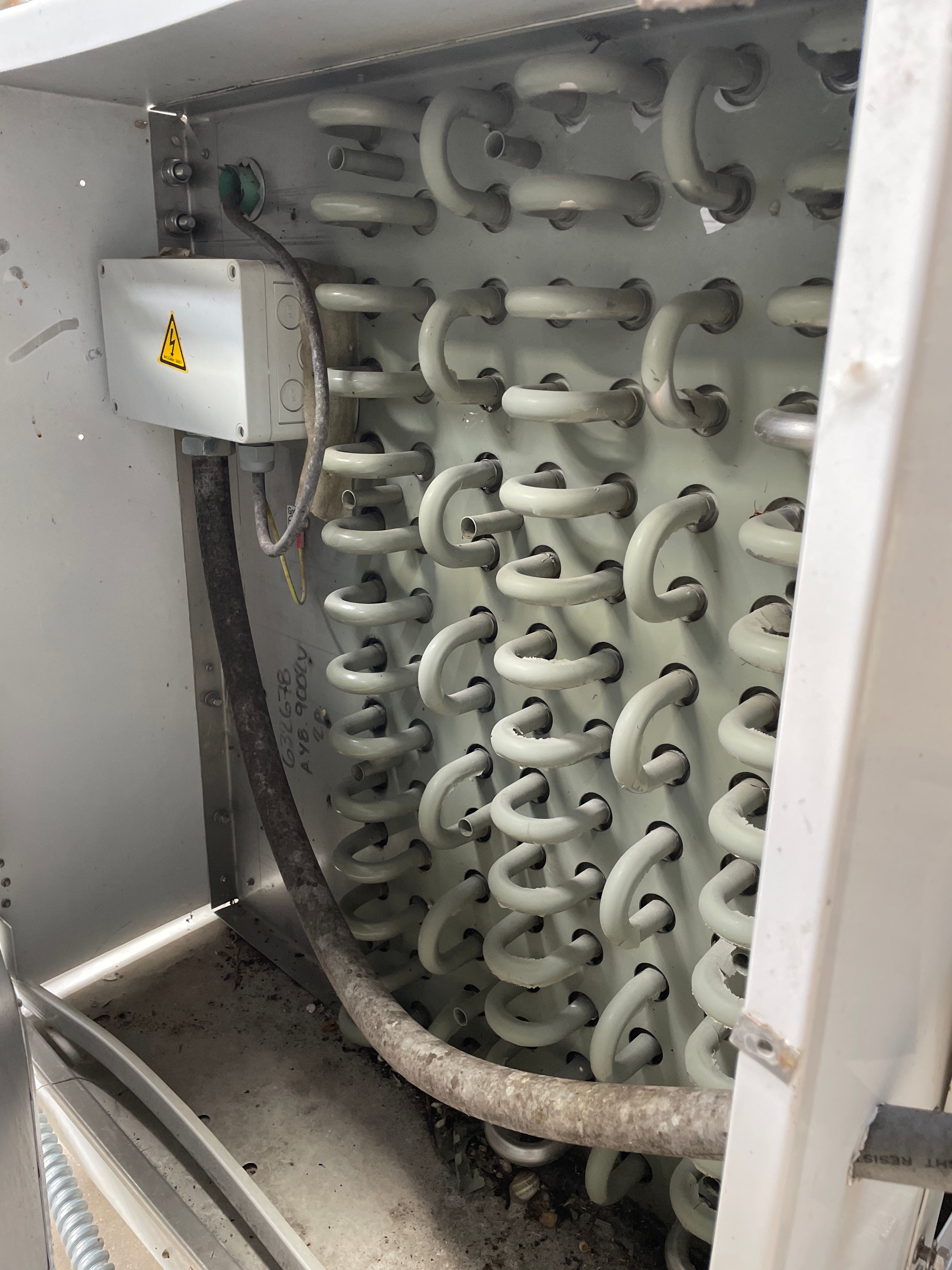 Guntner AGHN 050.2F/16-A0L/28P.M Ammonia Evaporator Coil- 4TR, 1 Fan (Low/Medium Temperature) This evaporator can be used with Low or Medium temperature coils. A wet capacity of 2911 (BTUH / °F TD) with an estimated tonnage of 3.64(TR) @15TD. A frosted capacity of 2825 (BTUH / °F TD) with an estimated tonnage of 4(TR) @15TD. An Airflow of 3974CFM, with a face velocity of 3974 Fpm. Top fed recirculated air defrosted coils.