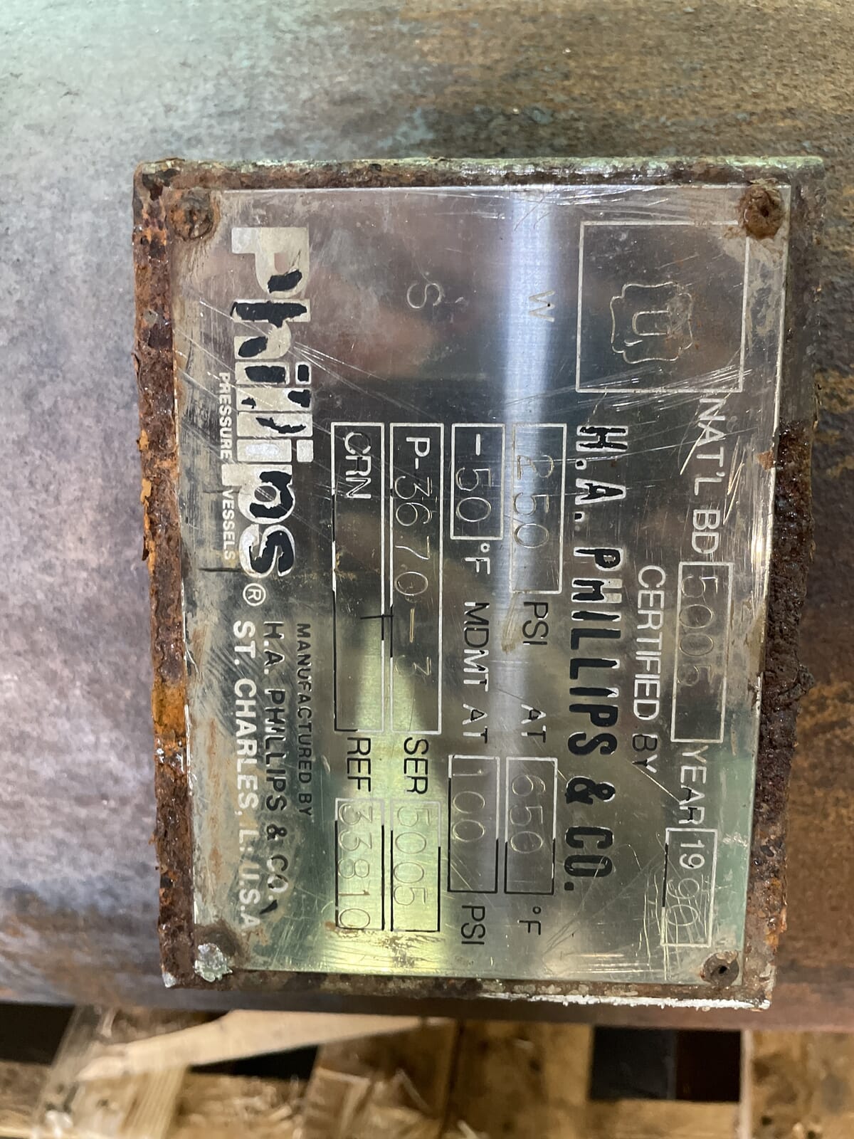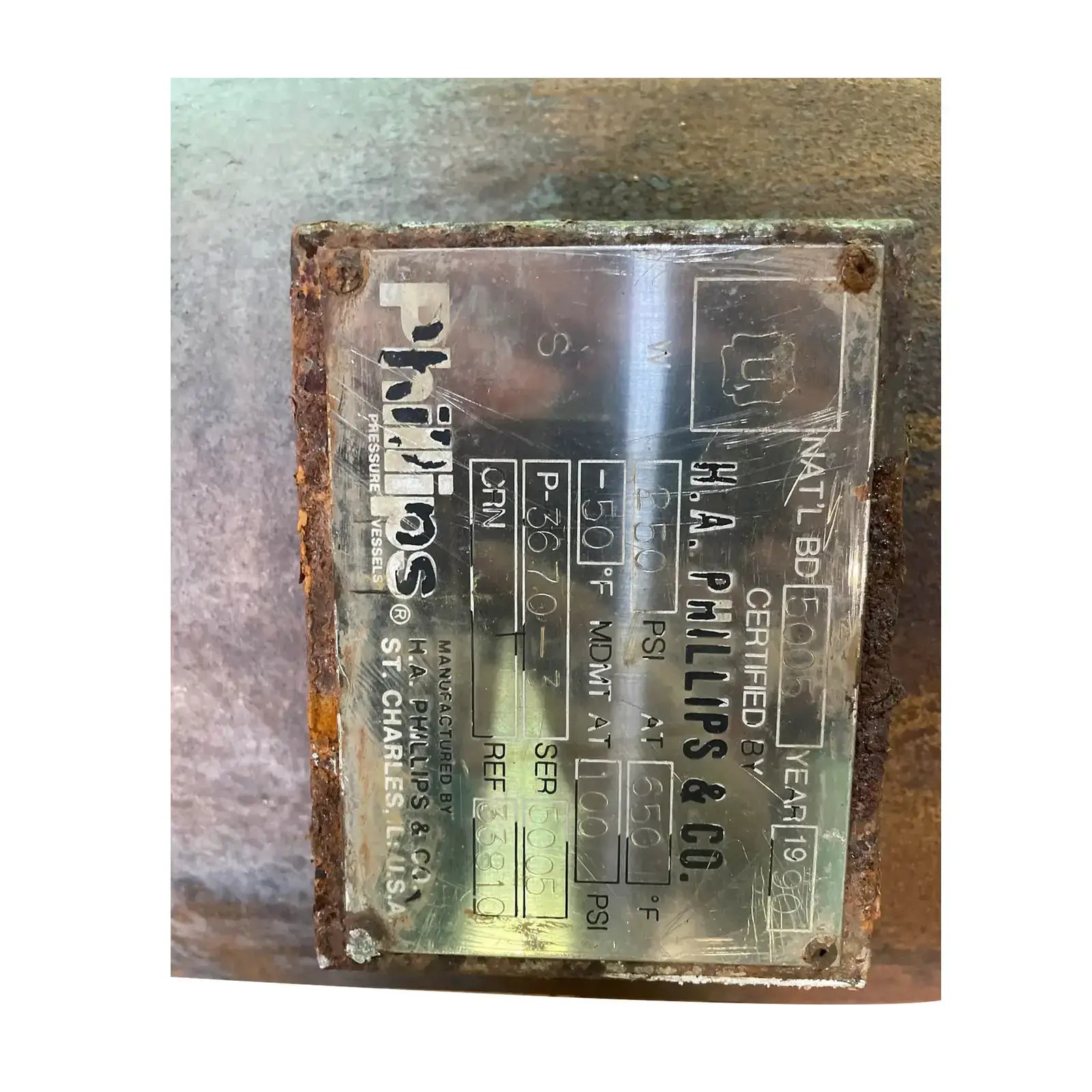 H.A Phillips Pumper Drum. Certified by H.A Phillips. National Board: 5005. REF No: 33810. Serial No: 5005. Year Manufactured: 1990. Max allowable working pressure: 250 PSIG. The temperature at maximum design pressure: is 650. Min Metal Temperature: -50. Pressure at Min. Metal Temperature: 100. Max. Design Working Pressure: 250. Overall Vessel Dimensions(in): 20 dia x 39 L. Total Capacity(Gal): 46.