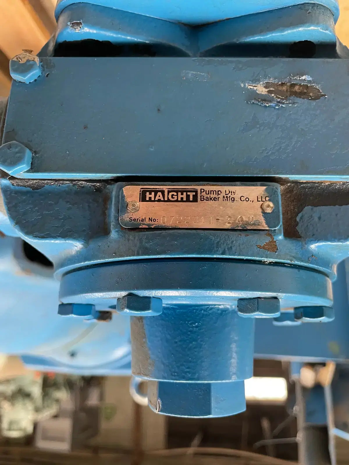 Haight 24U Series Internal Gear Pump. Model: 24U. Serial No: 0722311. Construction Material: Ductile Iron. Capacity(Max): 24 GPM. Discharge Pressure(Max): 250 PSI. Max Temperature Range: 625 F.