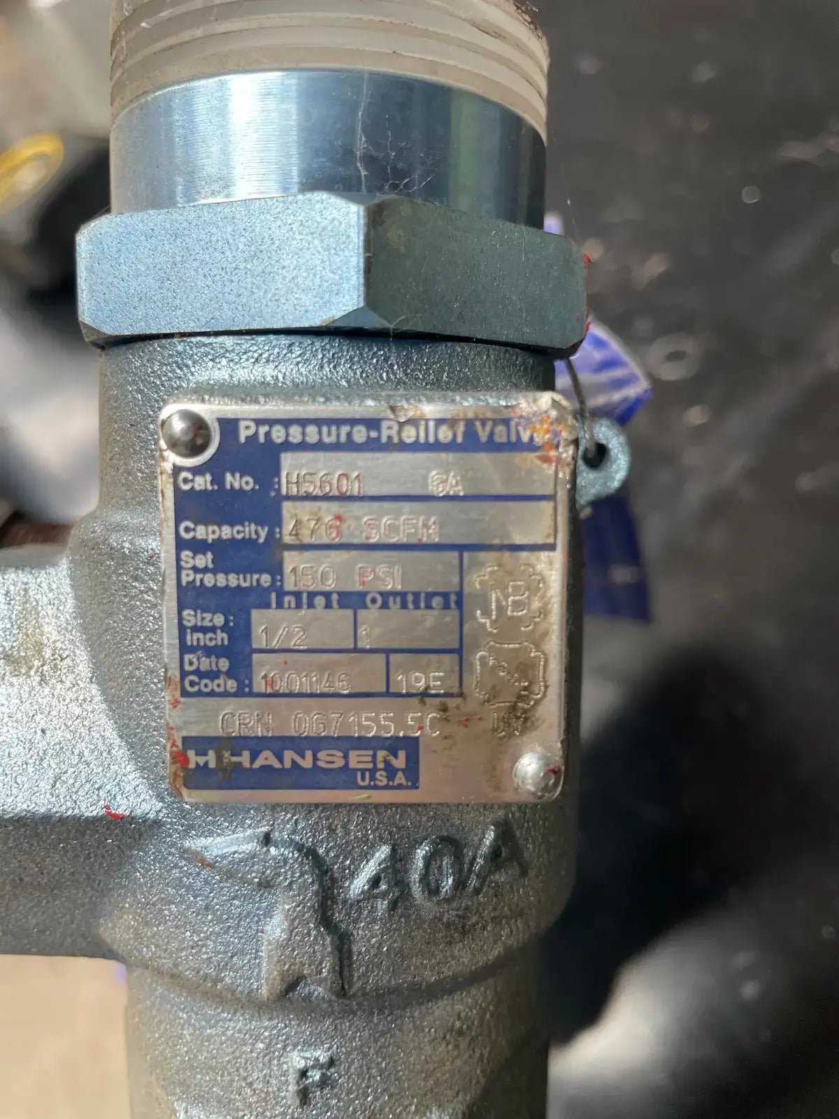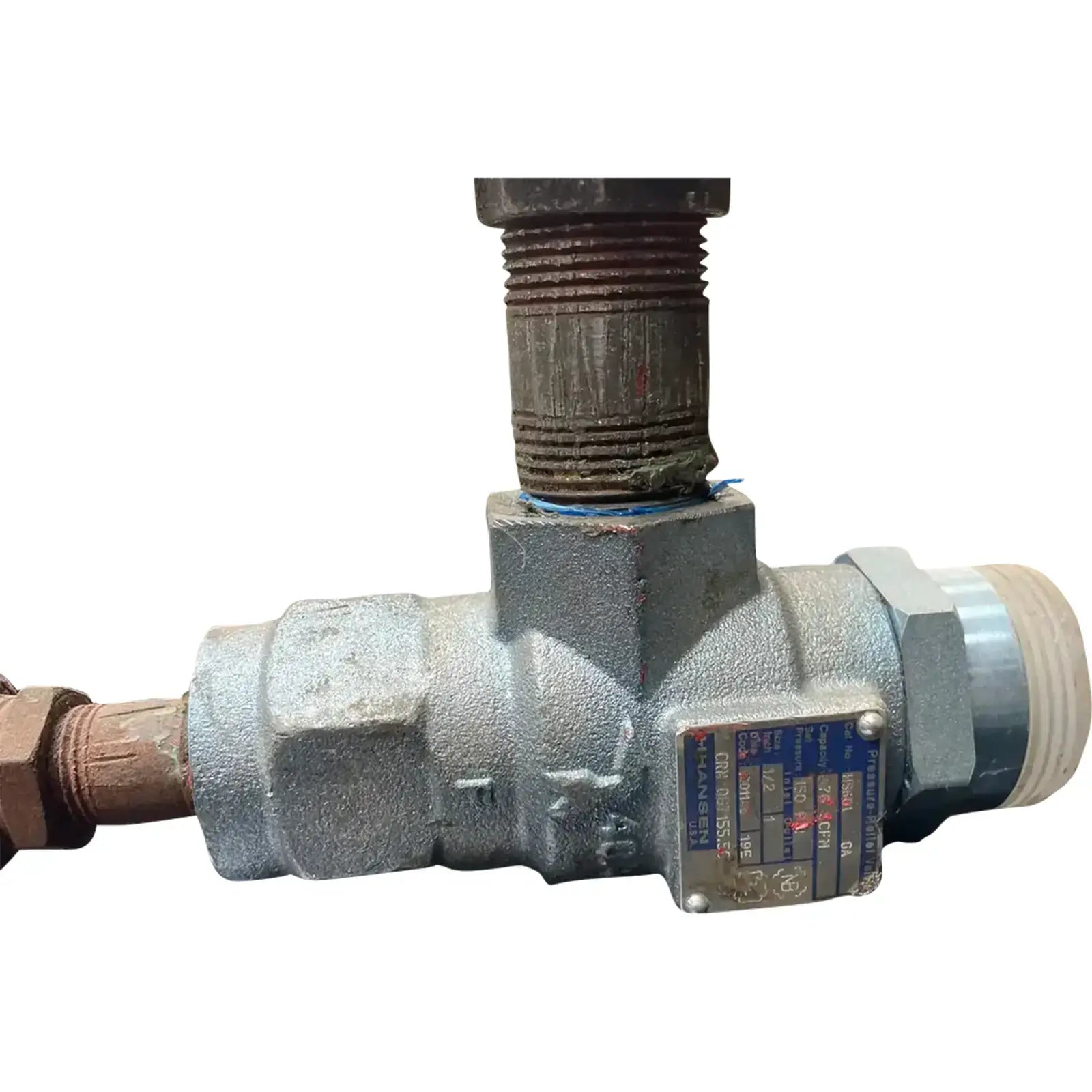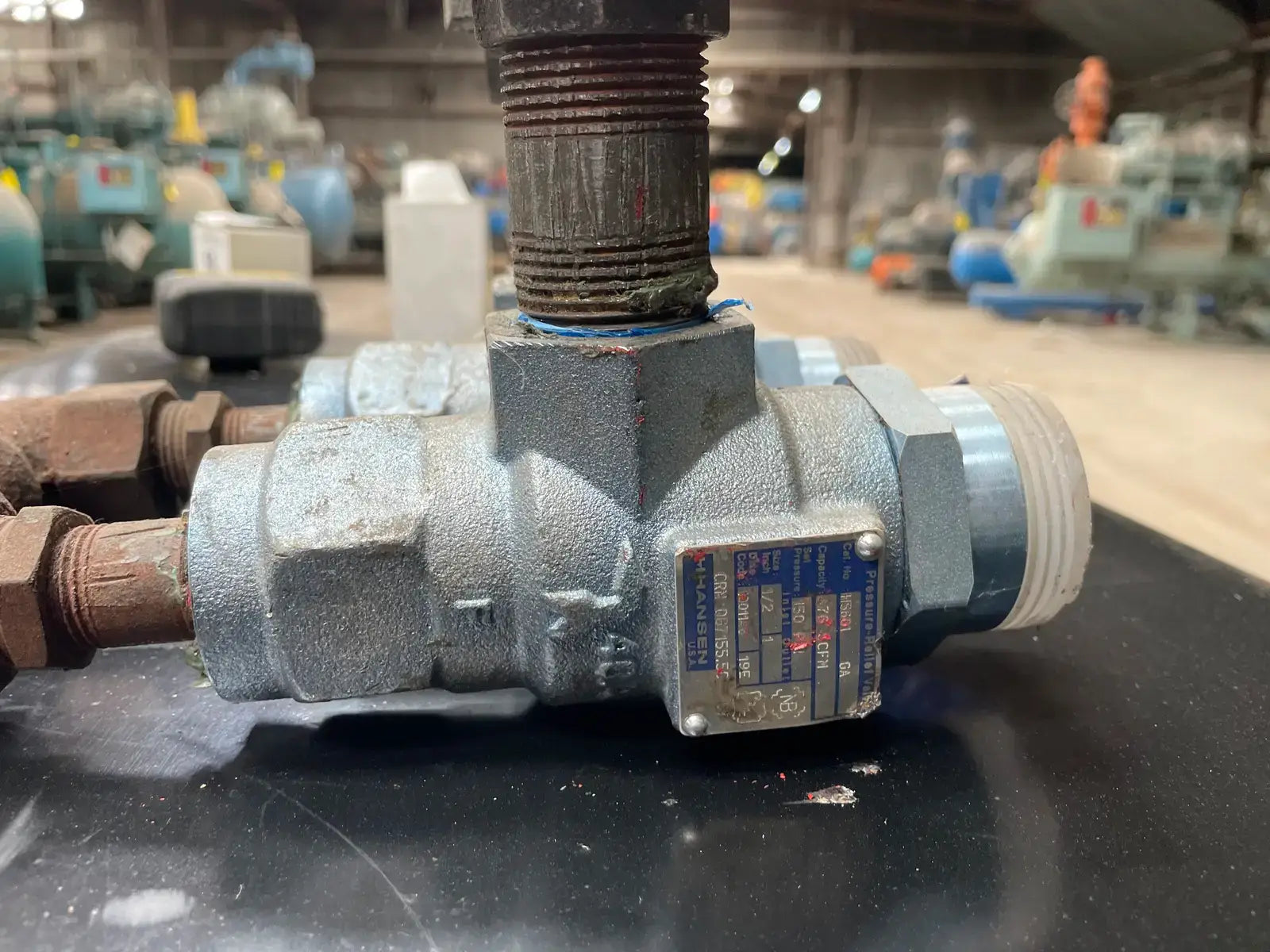 These Hansen Pressure Relief Valves are designed to provide emergency relief from excessive pressure in refrigerant-containing vessels. Cat No: H5601. Capacity: 150 PSI. Size: Inlet: 1/2, Outlet: 1.