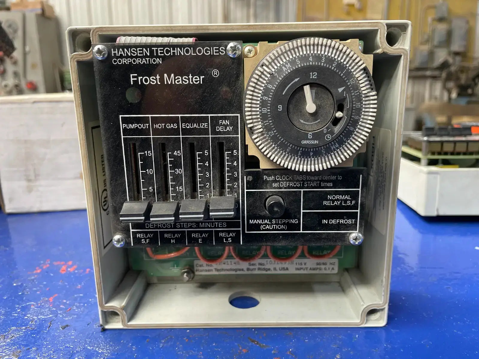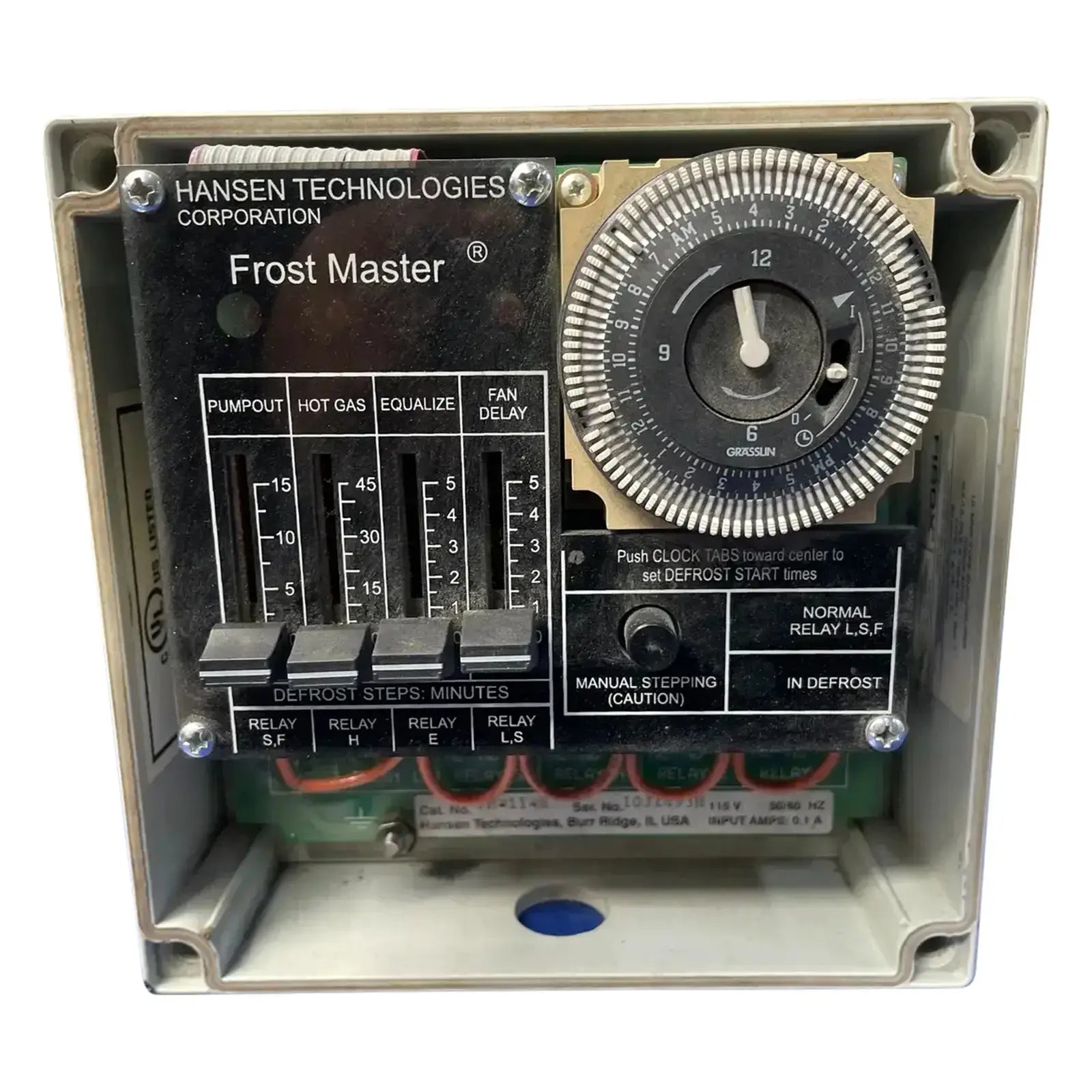 Hasen Technologies Frost Master Defrost Control. Cat No: FM-11-E. Serial No: 101J1493H. Power Supply: 115 Volt, 50/60 Hz. B