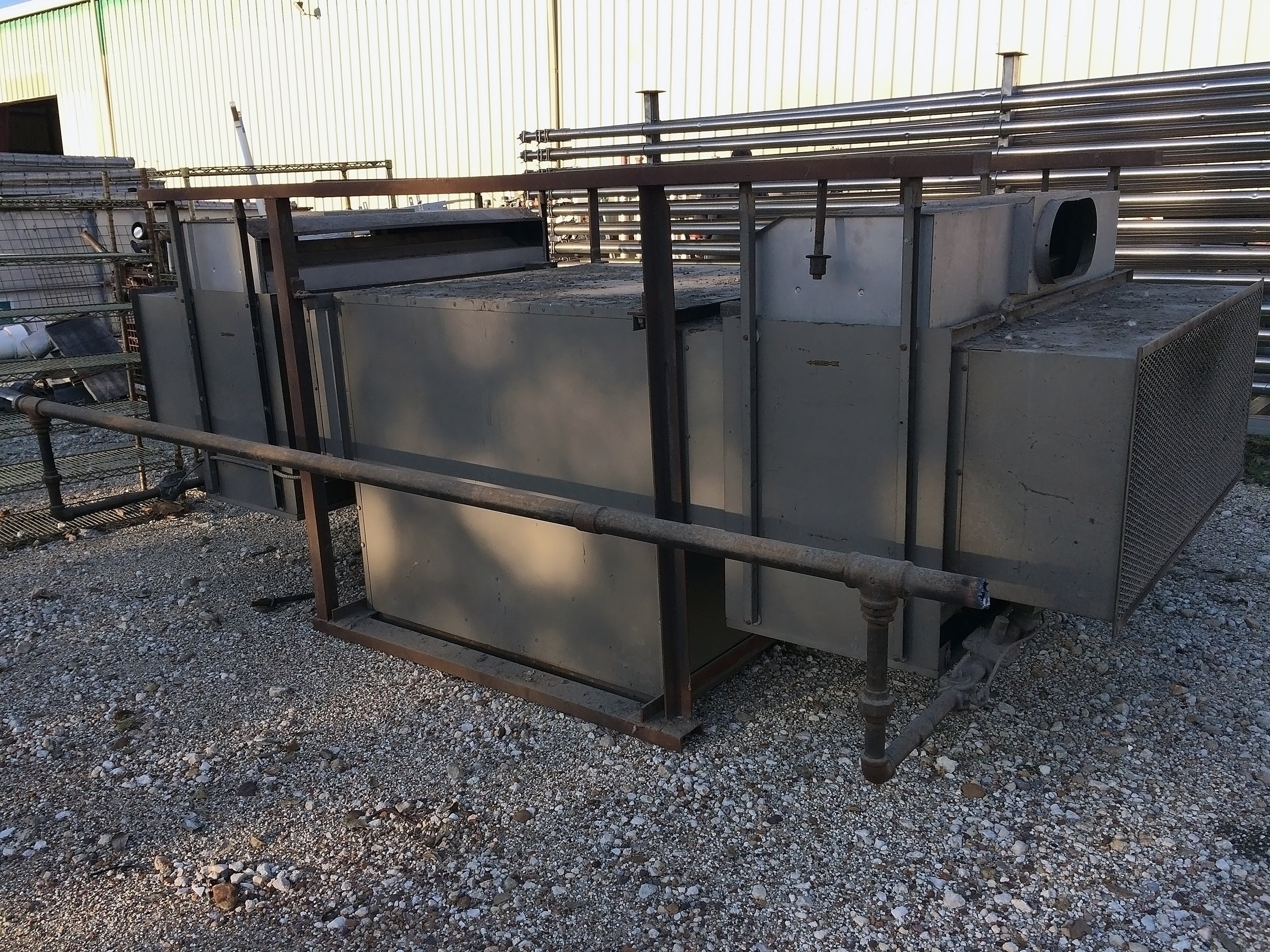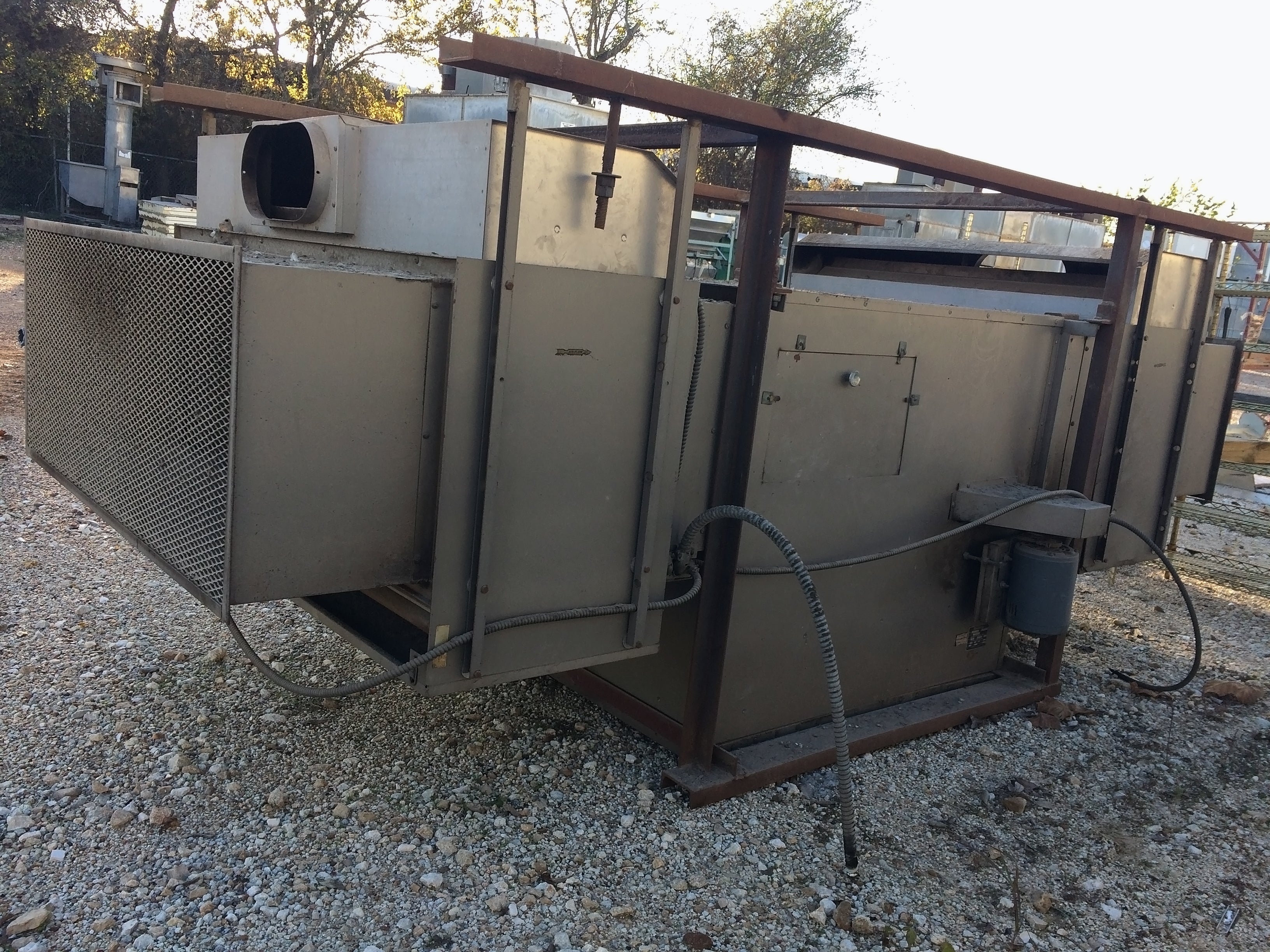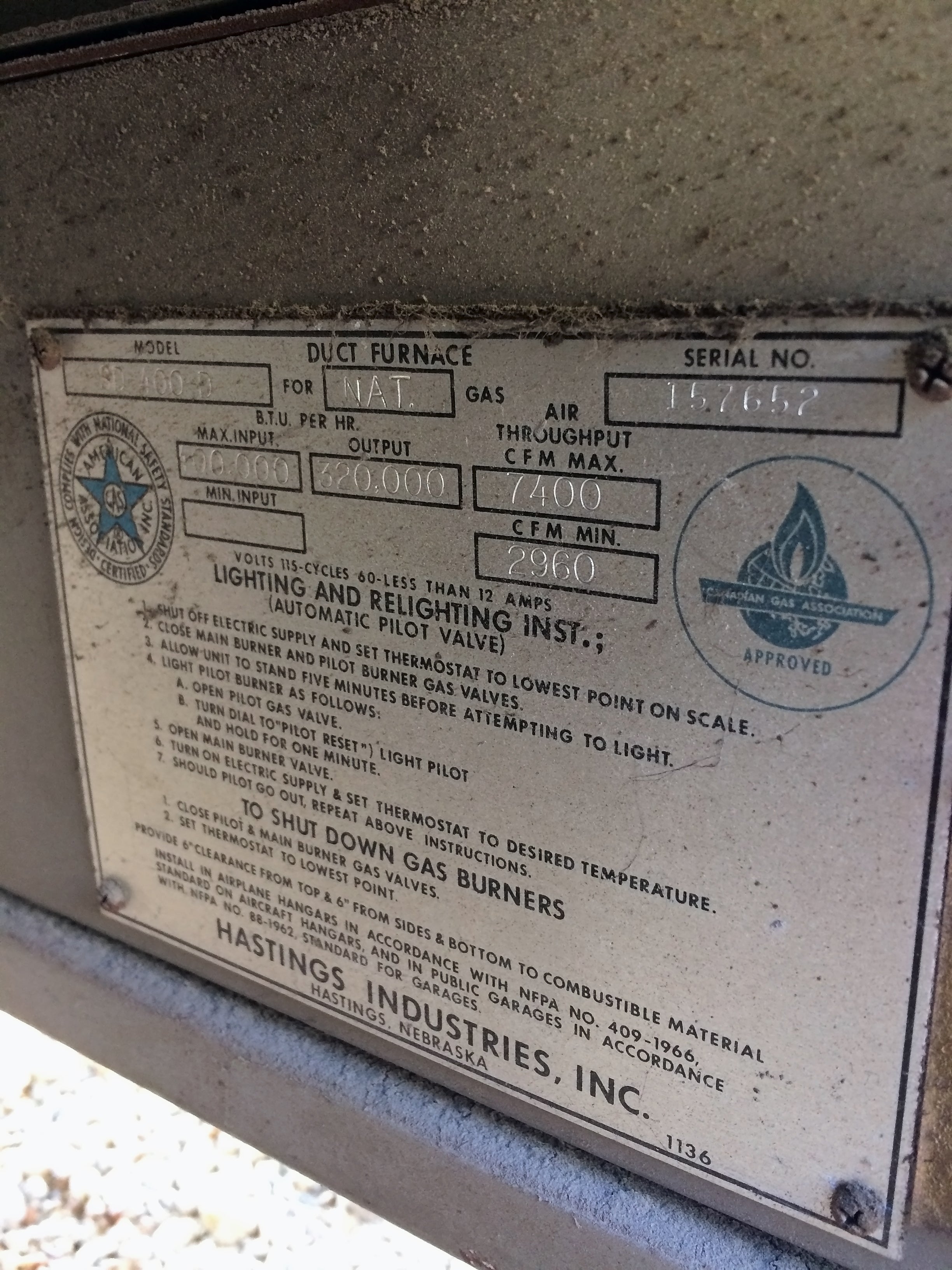 Hastings Industries, Inc. Hanging Furnace / Heater. Model: DF-800-S. Size: DF-800. Serial: 23468. Blower: 8450 CFM, 570 RPM. Motor: 1/2 HP, 1725 RPM, 460V, 3-phase, 60 Hz, 2.5 amps. Natural gas max output 320,000 BTU/hr (9.25 boiler HP).