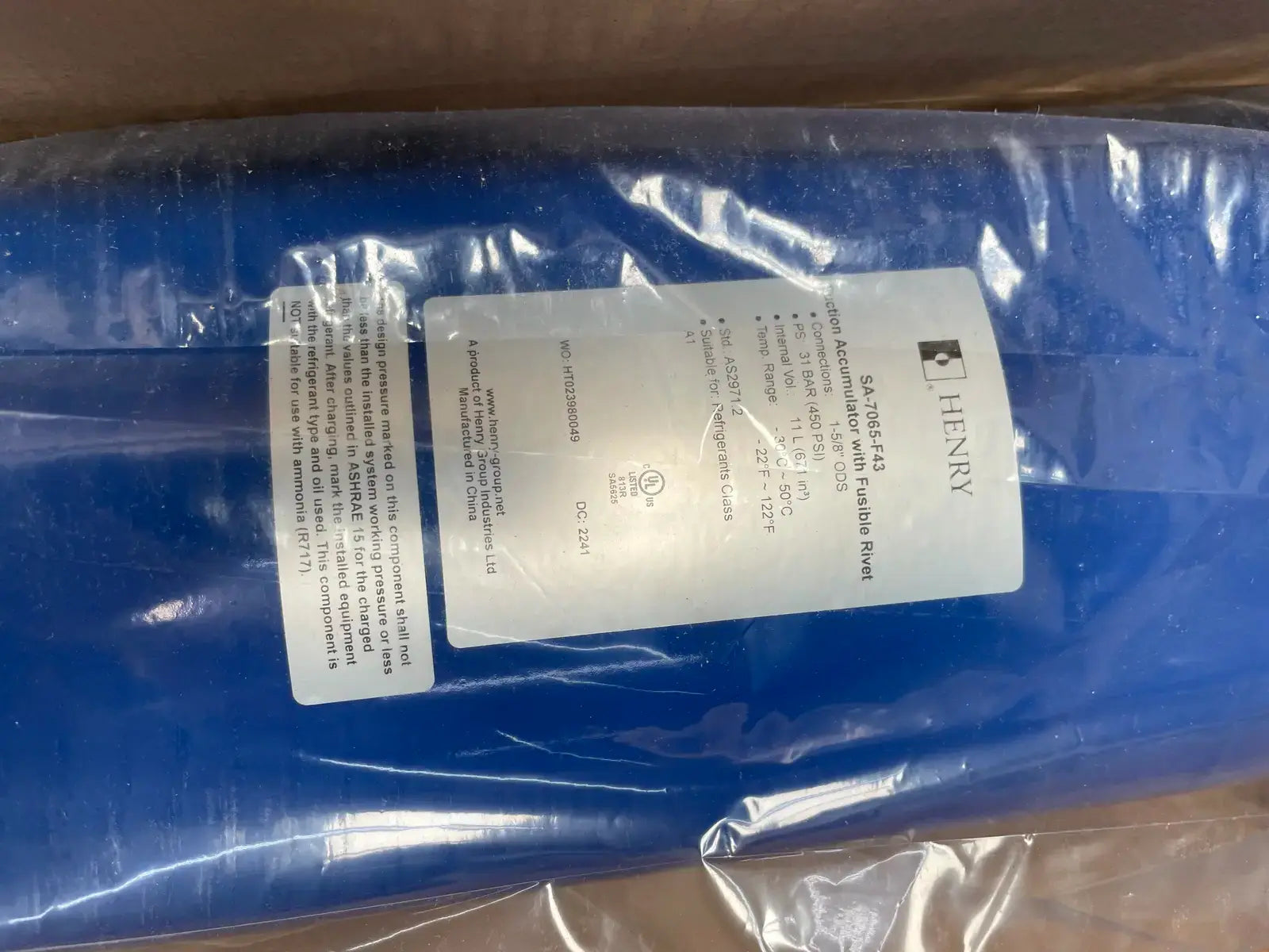 Henry Technologies SA Series Suction Line Accumulator. Cat No: SA-7065-F43. Temperature Range: -22F - 122F. Pressure Ratings: 31 BAR. Connections: 1-5/8" ODS. Suitable for Refrigerant Class A1.