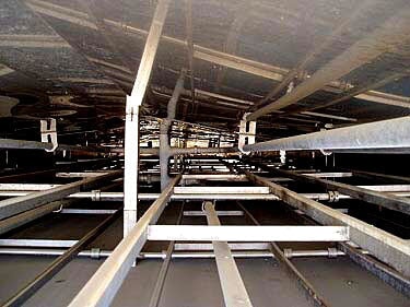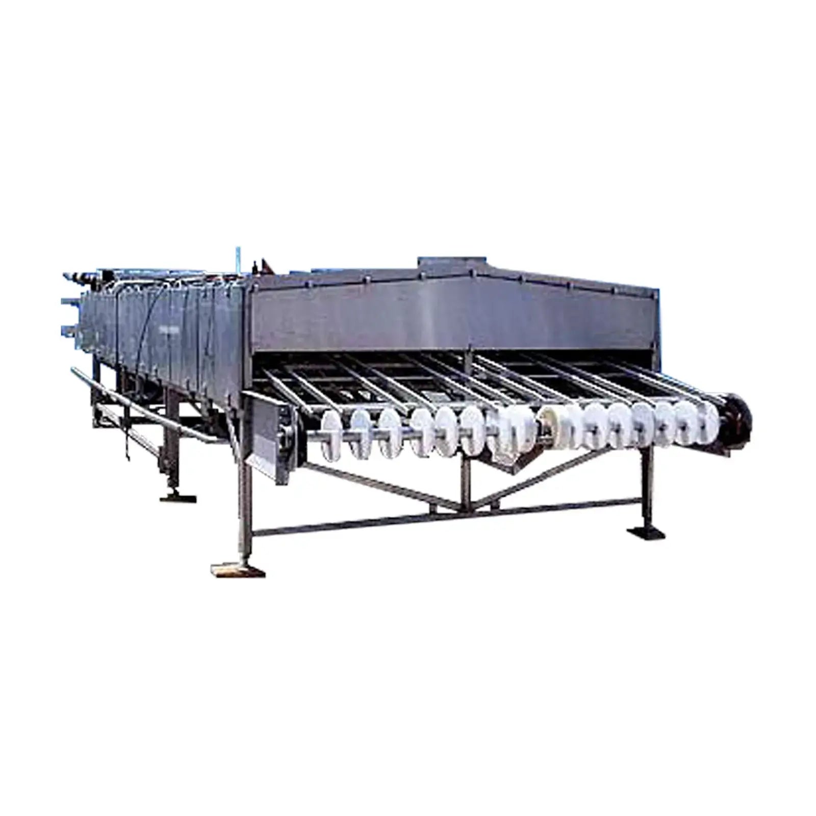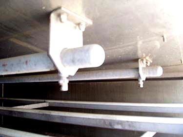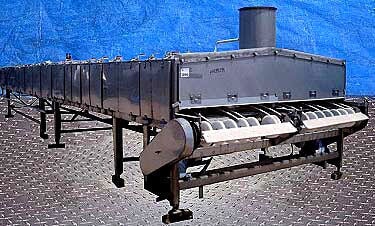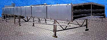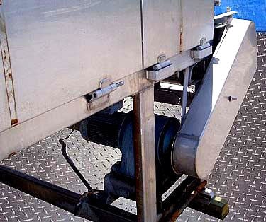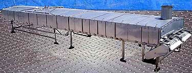 High Temperature Steam Tunnel. Stainless steel construction. Dual parallel feed chain-link belts. Maximum aperture/clearance above belt: 48 in. W x 3-1/2 in. H. Belt width: 47 in. Infeed/exit height: 38 in. H. (2) Sew-Eurodrive Motors, 5 hp, 1680 rpm, 230/460 V, 19.6/6.8 amps, 60 Hz, 3 phase. (2) Sew-Eurodrive Motor Drives, 38.47 ratio, 44 rpm (final). Inlets: (2) 1-1/2 in. dia. NPT (female, steam). Outlets: (1) 3 in. dia. stainless steel pipe (condensate), (1) 17-1/2 in. dia. vapor port with a 20 in. dia. flange and (12) 1/2 in. dia. thru-holes at a center-to-center distance of 5 in. Overall dimensions: 72 ft. 6 in. L x 10 ft. 8 in. W x 7 ft. 4 in. H.