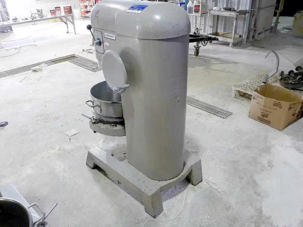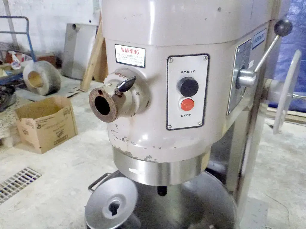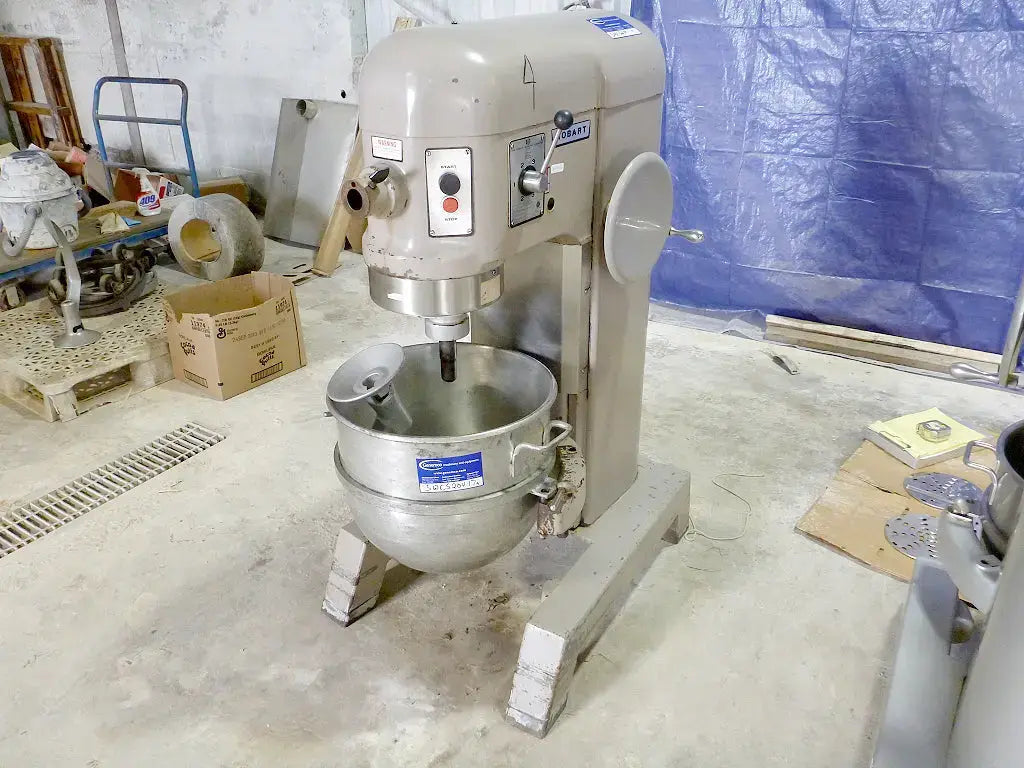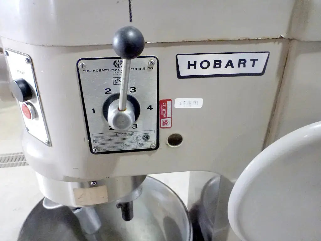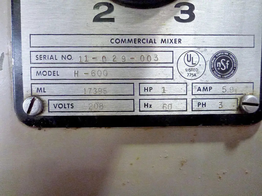 Hobart Corp. Commercial Mixer - 60 quart. Model: H600. Serial no: 11-029-003. ML 17395. 1 HP, 208 Volts, 5.9 Amps, 60 Hz, 3-phase. Four speed settings with 15 minute timer. Accessories Included: 60 Qt SS Bowl, 60 Qt Bowl Dolly, 60 Qt D-Wire Whip, 60 Qt E-Dough Arm. Unit also features a front accessory port. Made in U.S.A., UL Listed, NSF Approved. Weight: 750 lbs. Overall dimensions: 42 in. L x 30 in. W x 57 in. H. (ACN155).