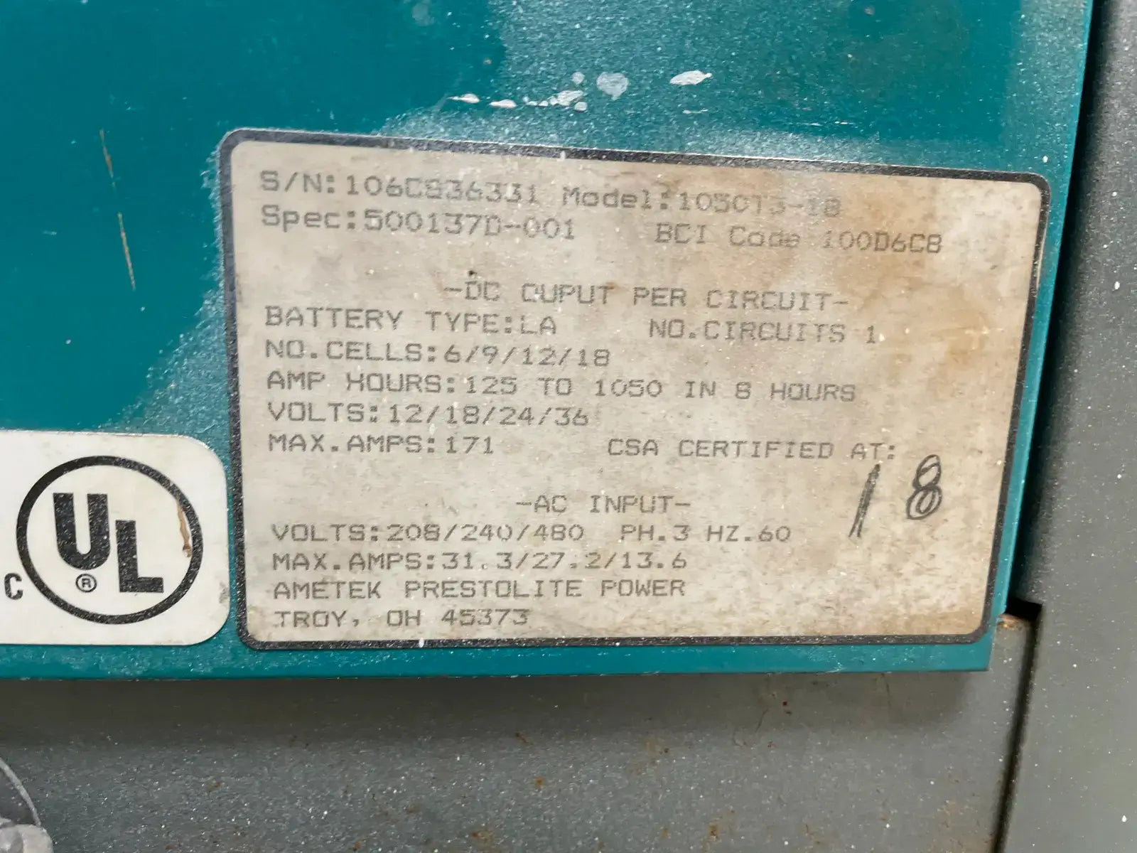 Hobart Ultra Charge Industrial Battery Charger. Serial No: 106C936331. Model: 1050T3-18. Spec: 500137D-001. BCI Code: 100D6C8. DC Output Per Circuit - Battery Type: LA. Number of Circuits: 1. Number of Cells: 6/9/12/18. Amp Hours: 125 To 1050 in 8 Hours. Volts: 12/18/24/36. Max Amps: 171. AC Input - Volts: 208/240/480. Ph: 3, Hz: 60. Max Amps: 31.3/27.2/13.6.