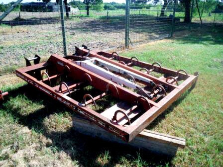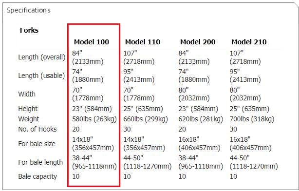 Hoelscher, Inc. Bushton, Kansas USA. Model: 100. Serial: 01686. The 100 series is for 14 inch x 18 inch bales (38-44 inches long). From the manufacturer: “Accumulated bales are quickly picked up with one of these forks mounted to your loader. These models are also ideal for all-around loading and stacking. Bales can be loaded on your own hay trailers, trucks, or semi-trailers”. Bale Capacity: 10. Number of hooks: 20. Width: 70 inches. Length (overall / usable): 84 in. / 74 in.