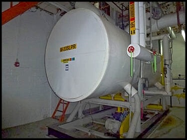 Horizontal Ammonia Recirculator Package. Vessel certified by Trusco Tank Inc. Fresno, CA USA. MAWP: 250 PSI at 650F. MDMT: -45F at 100 PSI. S/N: 145246. Year: 1988. Shell: 0.625 SA516-70. Head: 0.562 SA516-70. Surface area: 373 sq. ft. Capacity: 3458 gallons. Approximate dimensions: 20 ft. L x 6 ft. dia. Skid mounted with 2 pumps: Durco, Viking (both 10 HP, 230/460V, 60 Hz, 3-phase). Previously installed at a vegetable processing company in California (removed January 2013).
