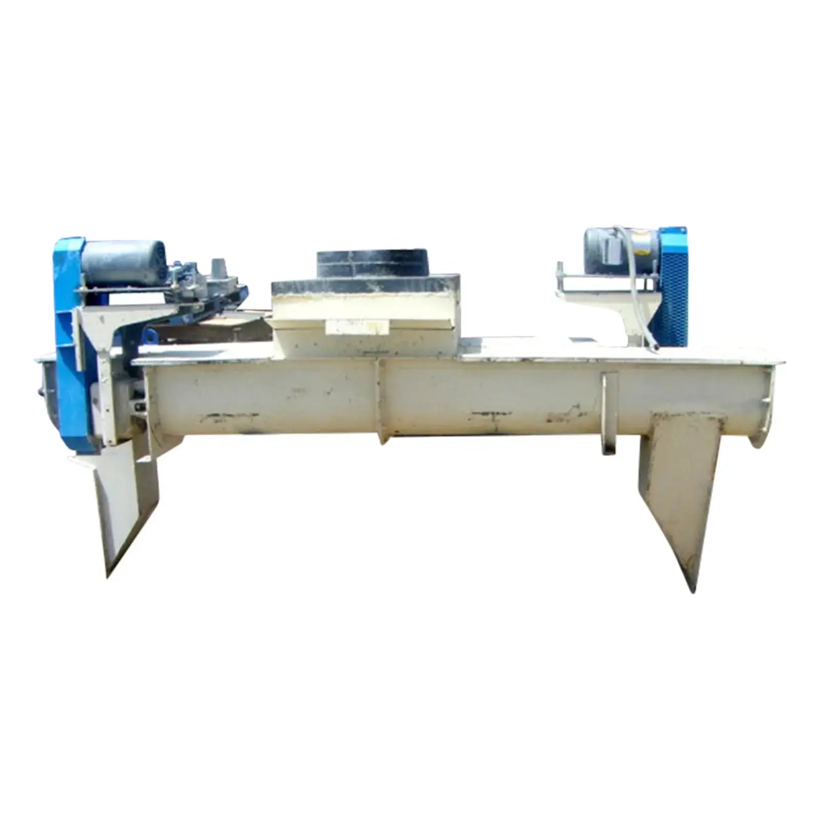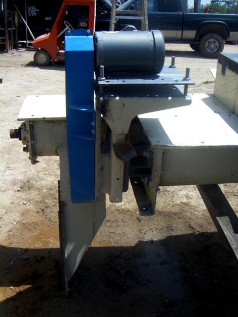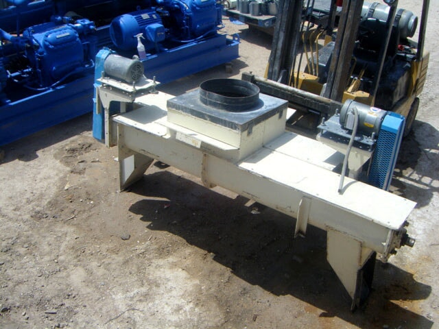 Horizontal Feeder Auger Conveyors. Approximately 7 ft. long w/ motors and drives. Double auger conveyor system, (1) 1 ft. 3 ½ in. diameter common centered infeed. Conveys in 2 directions. (2) trough approximate dimensions: 7 ft. L x 10 in. W x 1 ft. deep. (2) Baldor Electric motors, 1 ½ hp, (2) Falk enclosed gear drives, ratio: 14.43:1. Final rpm: 79. Inlet: (1) 1 ft. 3 ½ in. dia. port. Outlets: (1) 10 in. W x (1) 1 ft. 7 in. H, (1) 10 in. W x 1 ft. 8 in. H. Overall dimensions: 9 ft. 8 in. L x 3 ft. W x 4 ft. 8 in. H.(H16).