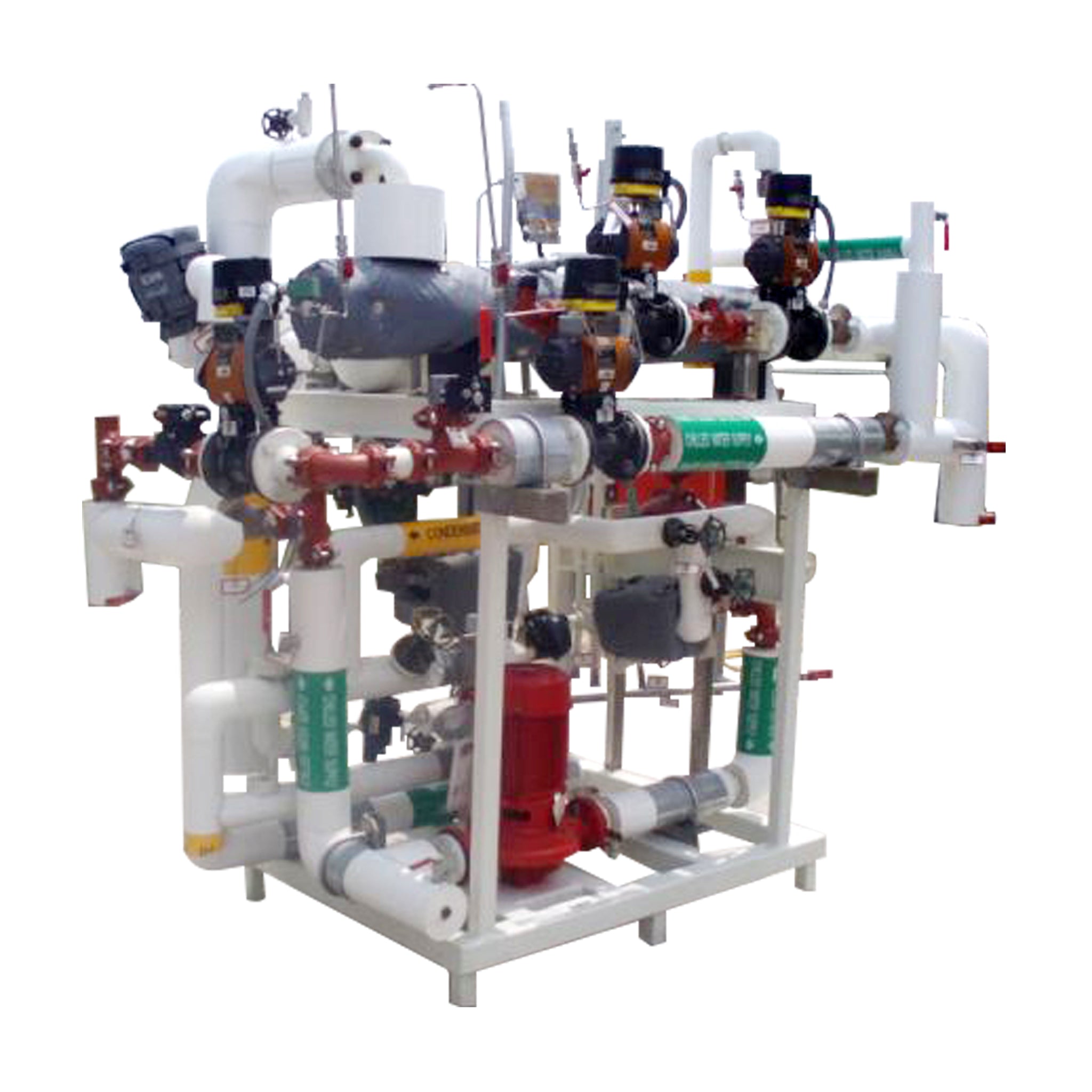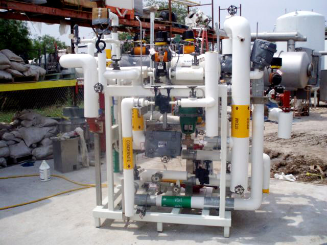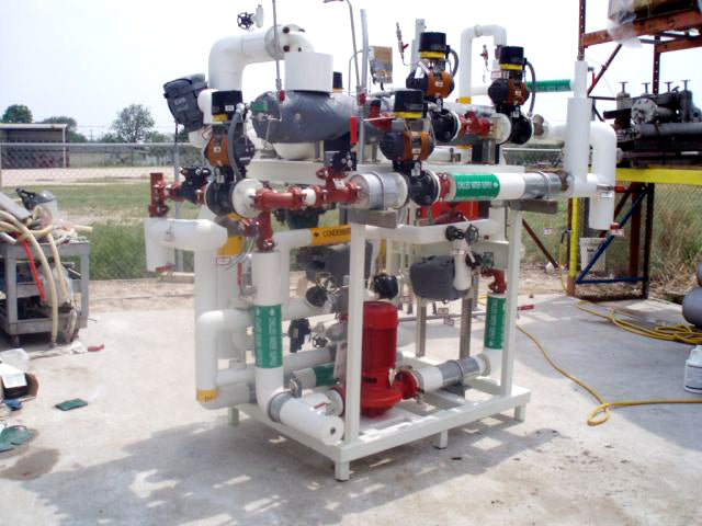 Hot Water Set. R.L. Deppman Centrifugal Pump. Model: 80-1.5x9.5-9BF. S/N: RLD2086D40. Capacity: 45 gpm. Motor, 3 hp, 1745 rpm, 208-230/460 V, 8.80-8.40/4.20 amps, 60 Hz, 3 phase. Inlets/outlets: (2) 2 in. dia. flanged port. Solution tank-8 gallons. Straight wall dimensions: 11-1/2 in. dia. x 17-1/2 in. L. Lagrange Products Shell & Tube Heat Exchanger. Model: 0564-2043. S/N: 226466. Customer No.6235225. MAWP: 150 psi @ 400°F. MDMT: -20°F @ 150 psi. Number of tubes: 17. Tube dimensions: 1/2 in. dia. x 5 ft. 2-1/2 in. L. Heat transfer surface area: approx. 11 sq. ft. Capacity: 0.90 gallons. Inlets: (1) 1-1/2 in. dia. ACME fittings, (1) 1-1/2 in. dia. ACME fittings (steam).Outlets: (1) 1-1/2 in. dia. ACME fittings, (1) 1 in. dia. NPT fittings (steam). (6) Worcestor Pnematic Acutator. Model: 2040. S/N: 6C0229. MAWP: 120 psi. Output torque: 265 lb-in. @ 60 psi. Flowserve Vogt Valve. Inlets/outlets: (2) 1 in. dia. NPT fittings. Kunkle Valve Diverter. Model: 910BDCM06AJE. Size: 1/2 in. Capacity: 40 gpm. MAWP: 135 psig. Inlets: (1) 1 in. dia. port (steam), (1) 1 in. dia. port (chilled water), (1) 1 in. dia. port (condensate). Outlets: (1) 1 in. dia. port (steam), (1) 1 in. dia. port (chilled water), (1) 1 in. dia. port (condensate). Overall dimensions: 7 ft. 10 in. L x 4 ft. 7 in. W x 8 ft. H.
