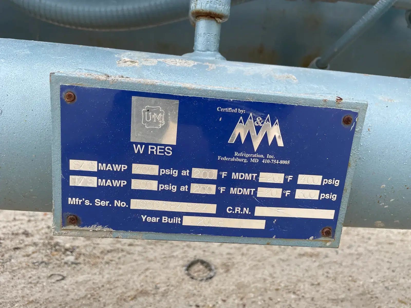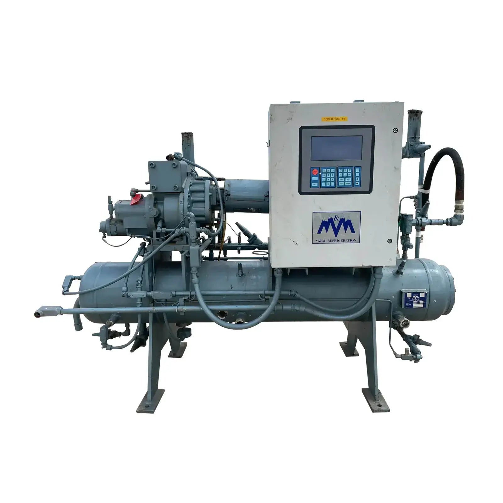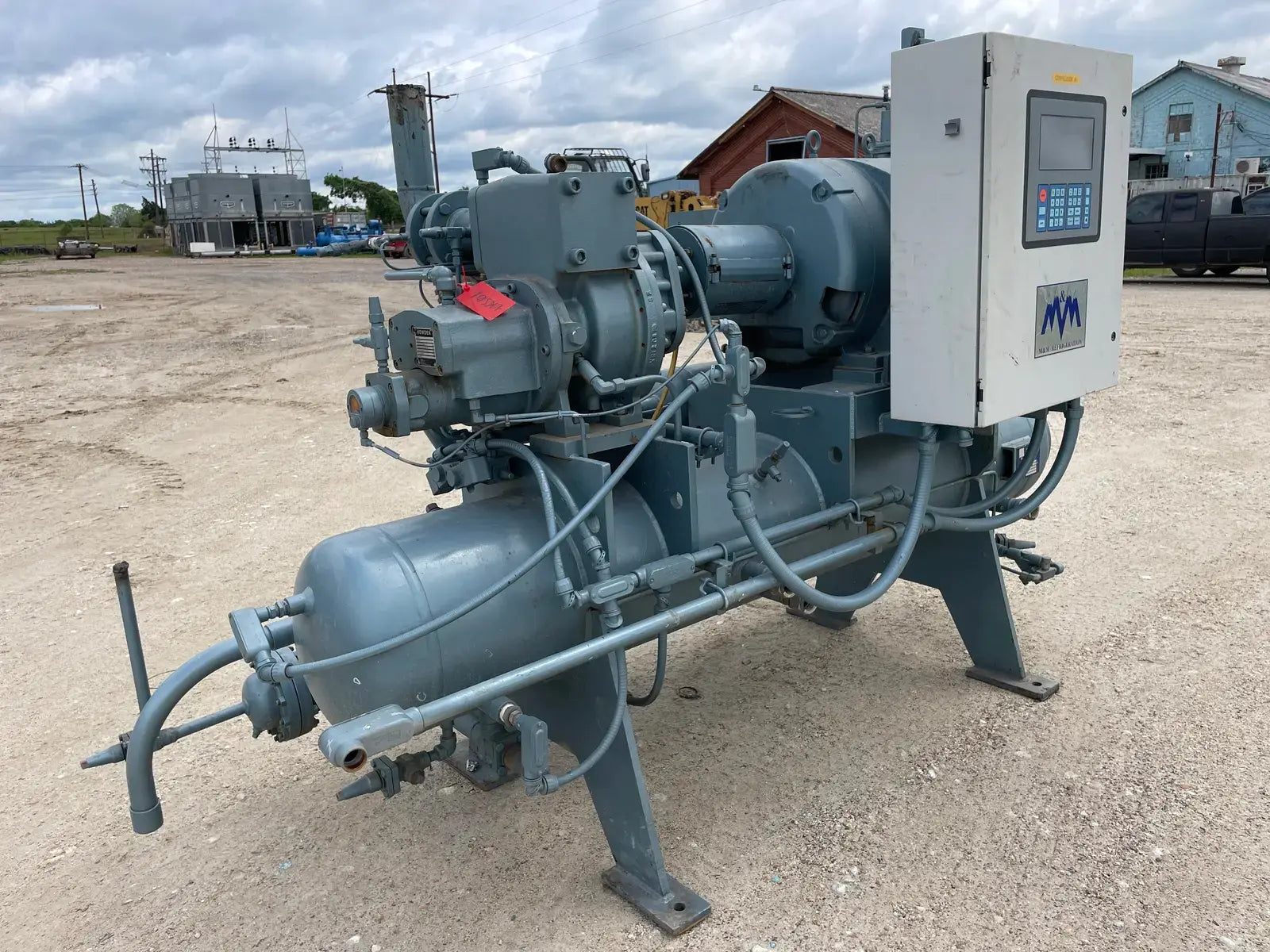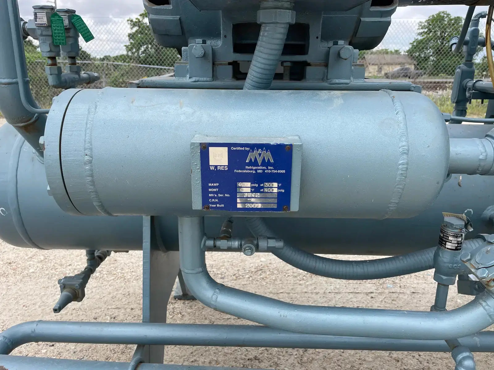 Howden Rotary Screw Compressor Package. Serial No: MK4/XRV127R3/1660. Contract No: J013705XR12304-1EN. Hydraulic Test Pressure: 37.00 Bar G. Max Working Pressure - High Side: 21.00 Bar G. Max Working Pressure - Low Side: 5.00 Bar G. Max Input Speed: 3600 RPM. Gear Ratio: 1.353. Suction Port: 4 in. Discharge Port: 2 in. Certified by M&M Refrigeration Oil Separator: National Board: 3001. MAWP: 300 PSI @ 300 F. MDMT: 0 F @ 300 PSIG. Marathon Electric Motor: HP: 125, RPM: 3565, Volts: 460, Hz: 60, FLA: 138.