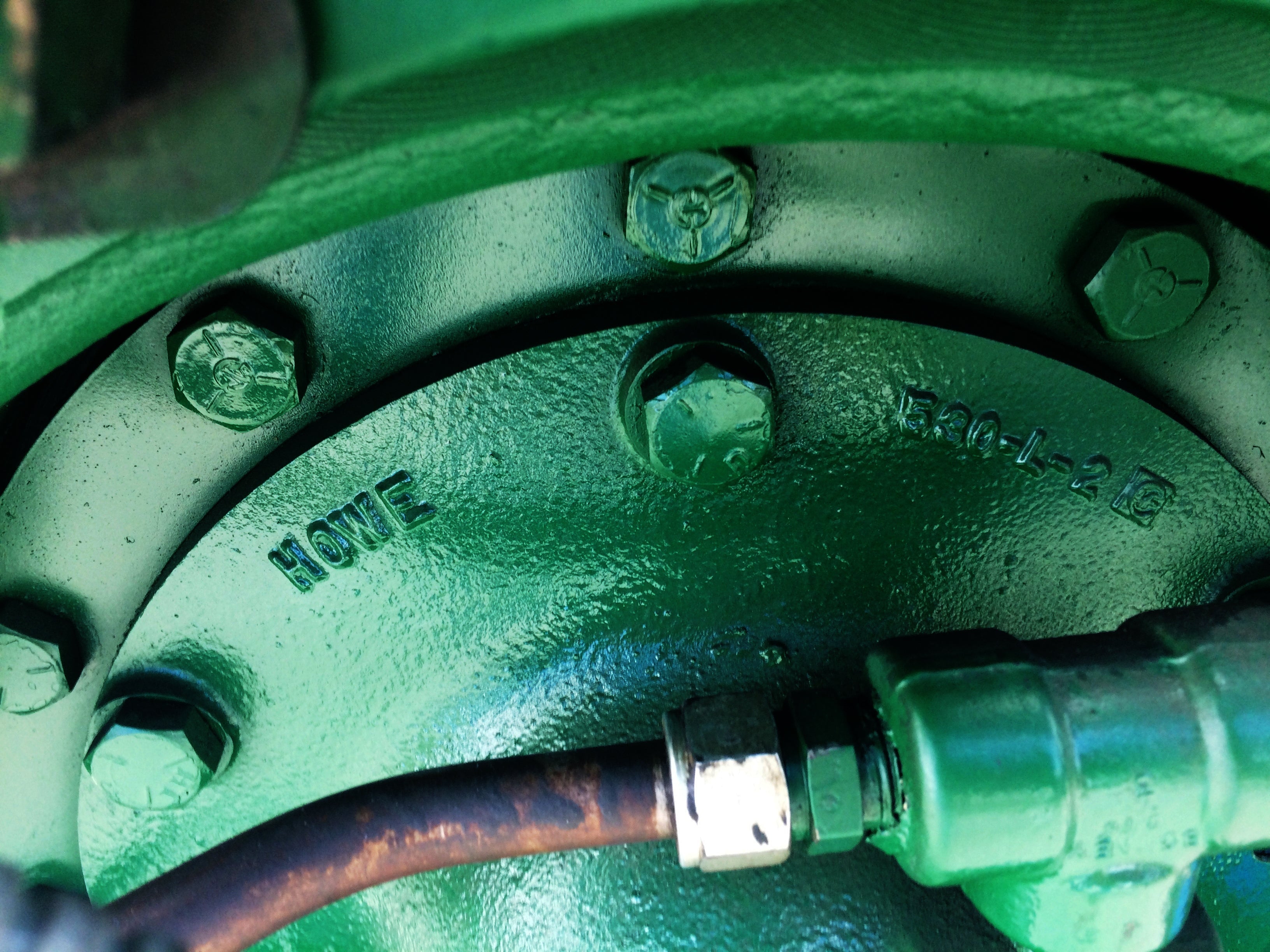 Howe Reciprocating Compressor. Model J-56. Refrigerant: ammonia. Number of cylinders: 6. Zero Mfg. Co hours since factory rebuild. Setup for booster application. Markings: 530-L-2, 540-A-2. Marathon Electric Series E motor: 75 HP, 1775 RPM, 230/460V, 176/88 amps, 60 Hz, 3-phase, 365T Frame (also rated for 190/380V, 50 Hz). Nominal booster rating (ammonia): 26.90 TR / 45.20 BHP at -40F / +25.8F. Nominal booster rating (R22 freon): 27.15 TR / 60.10 BHP at -40F / +20F. Max pressure differential: 175 PSIG. Max discharge temp: 300F. Weight: 4,600 lbs. Dimensions: 84 L x 60 W x 60 H (inches).