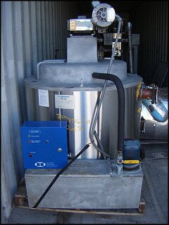 2005 Howe Corporation Stainless Steel Rapid Freeze Flake Ice Maker. Model: 50-EA. Rated production capacity: 5 tons per 24 hour period. Refrigerant: Flooded ammonia. Material of construction: stainless steel. Power requirements: 208-230/1/60. Pump motor: 1/6 HP, 3450/2850 RPM, 230 V, 1.6/2.0 A, 60/50 Hz, single phase. Drive motor: Marathon Electric 1 HP, 1725 RPM, 115/208-230 V, 13.4/6.8-6.7 A, 60 Hz, single phase. Winsmith drive ratio: 750. Drive output: 2.3 RPM. Inputs/outputs: (1) 2 in. pipe, (2) 1 in. NPT, (1) ¾ in. NPT, (4) 2 in. flange (2 on ice maker, 2 on receiver used to join the two sections together). Ice maker overall dimensions: 4 ft. 5 in. L x 3 ft. 10 in. W x 4 ft. 10 in. H. Refrigerant receiver overall dimensions: 6 ft. 3 in. L x 4 ft. 11 in. W x 4 ft. 5 in. H.(H16)(ACN256).