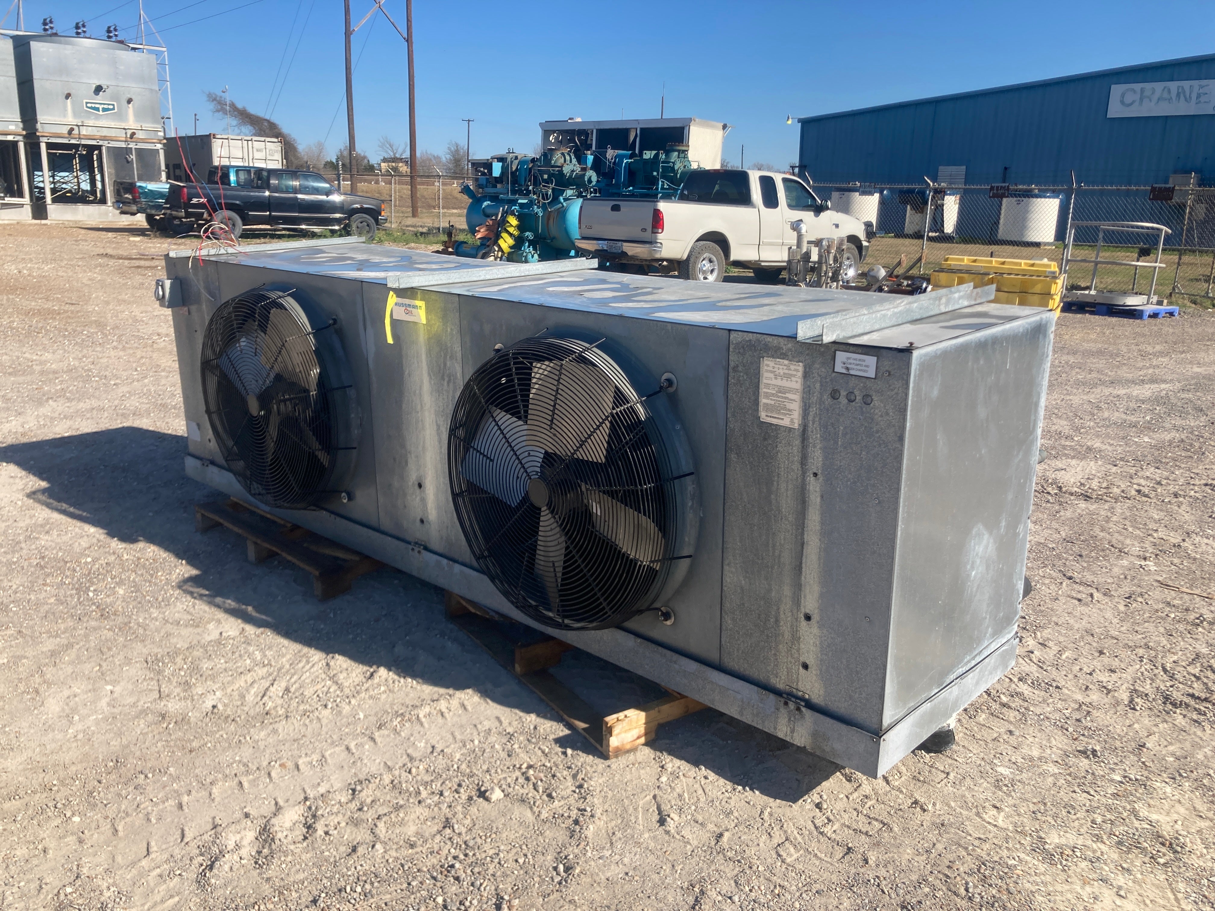 Hussmann SM24E-989-AMM 460/3 T IP Evaporator Coil - 12.975 TR, 2 Fan (Low/ Medium Temperature) Can be used with wet or frosted coils. A Frosted capacity of 9890 (BTUH / °F TD) with an estimated tonnage of 12(TR) @15TD(TR) @15TD. A wet capacity of 10380 (BTUH / °F TD) with an estimated tonnage of 12.975(TR) @15TD. An air flow of 18400 CFM. Recirculated top feed coils with electric defrost. 4 fins per inch and 2 fans. Previously used with freon. The evaporator coil is the component in your industrial refrigeration system that absorbs the heat from the air and cools the environment. The higher the tonnage or BTU capacity, the larger the area that can be cooled down or the cooler you can make the area. The evap coil works in coordination with your refrigeration system including screw or reciprocating compressors, evaporative condensers and pressure vessels. For more info contact our Genemco Sales team at (979) 268-7447 or sales@genemco.com