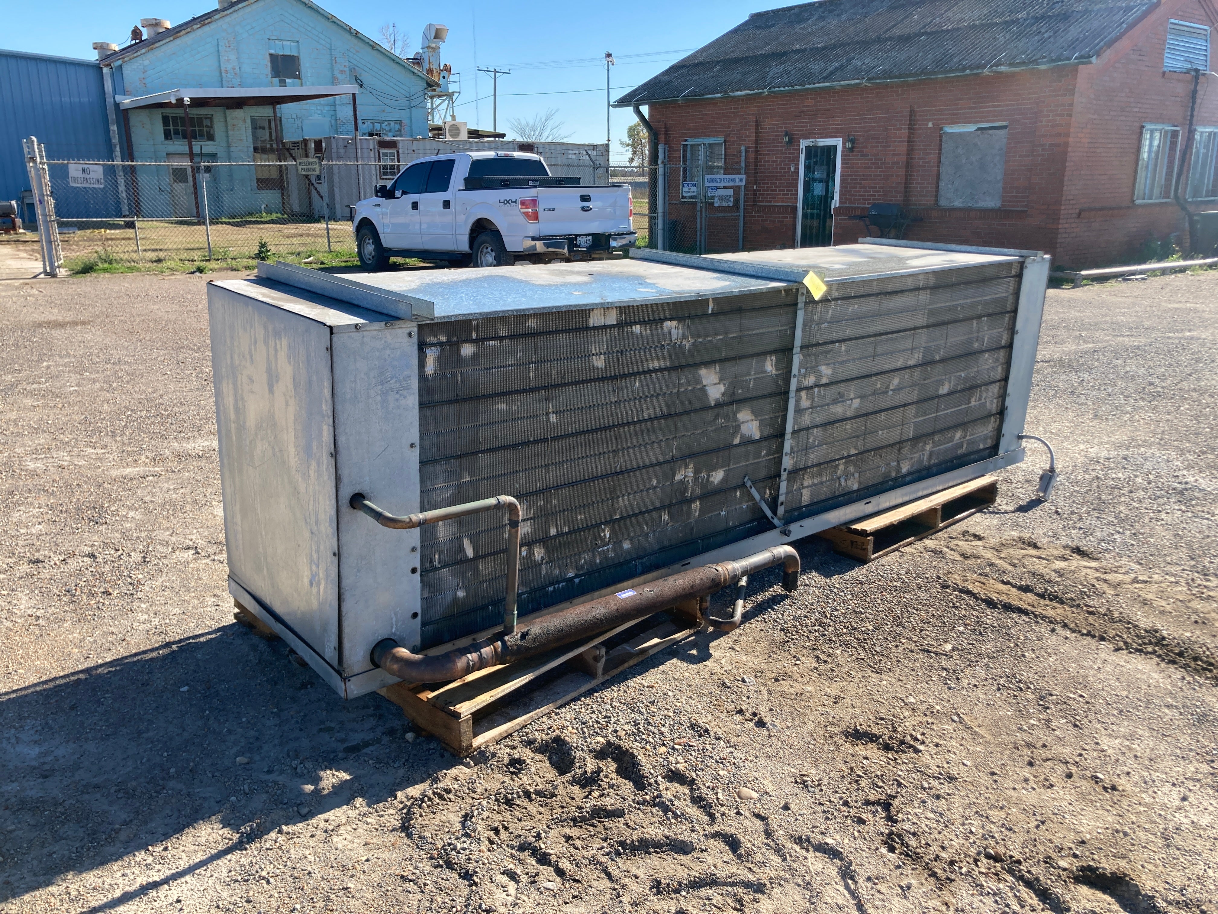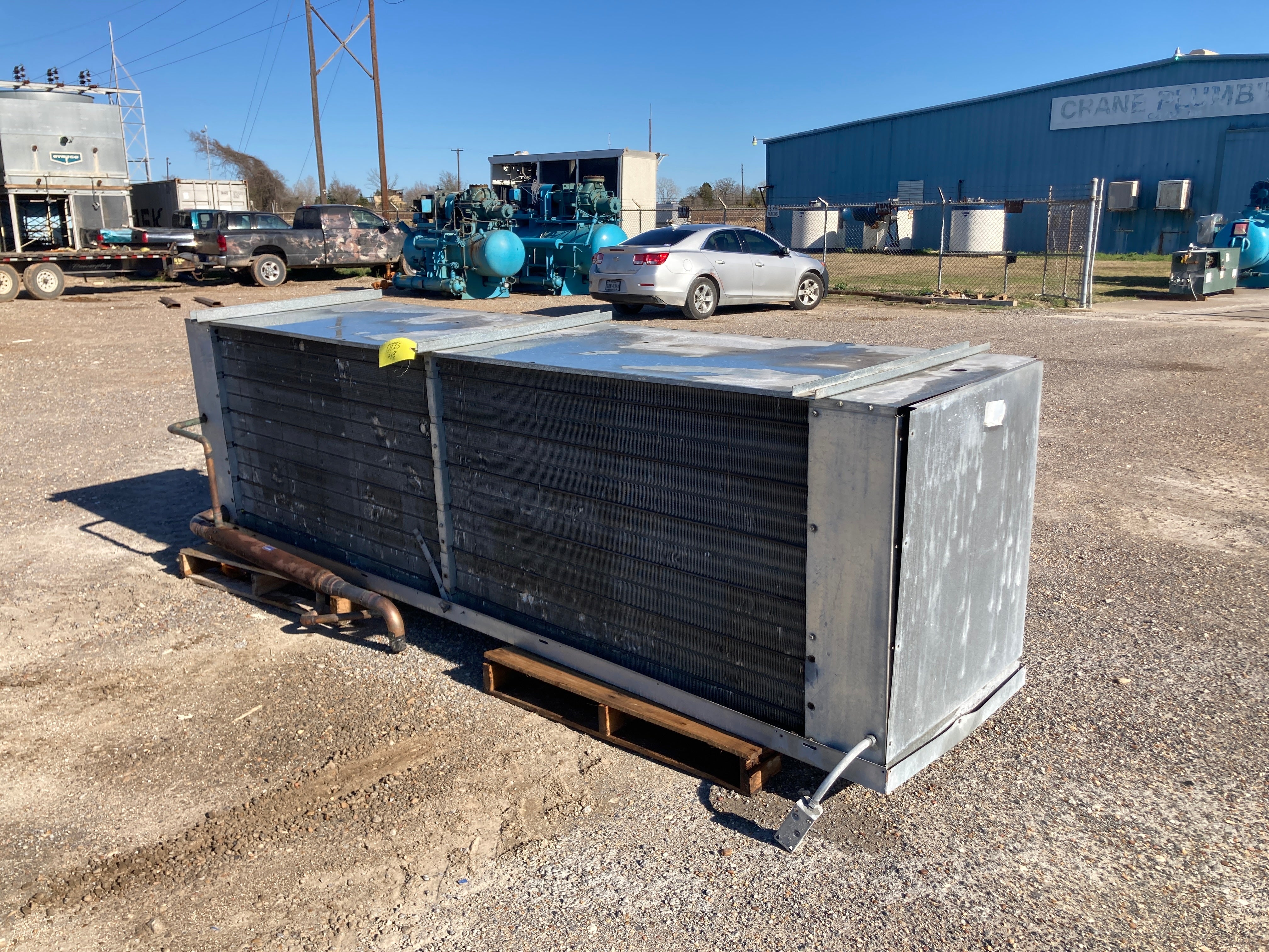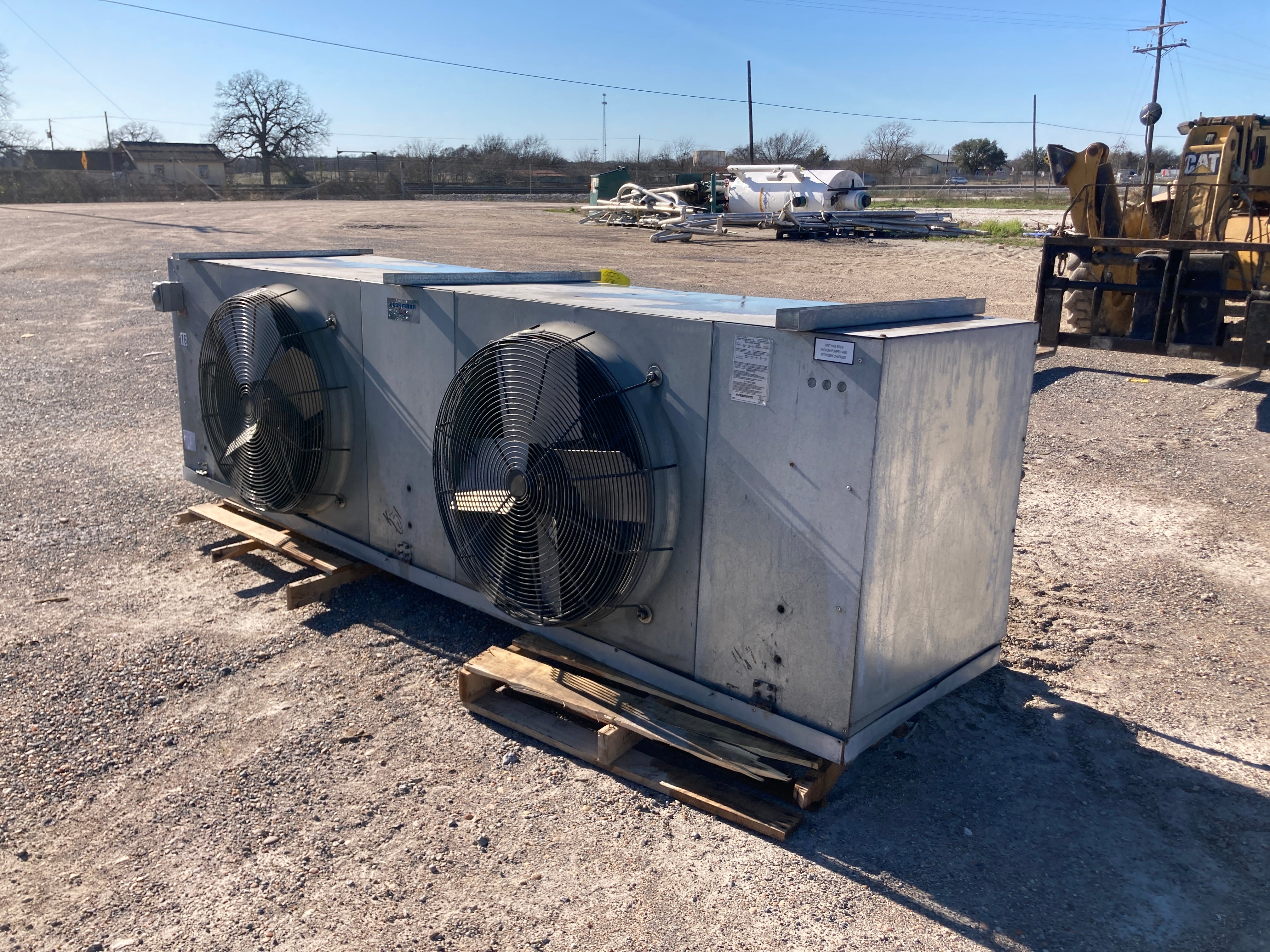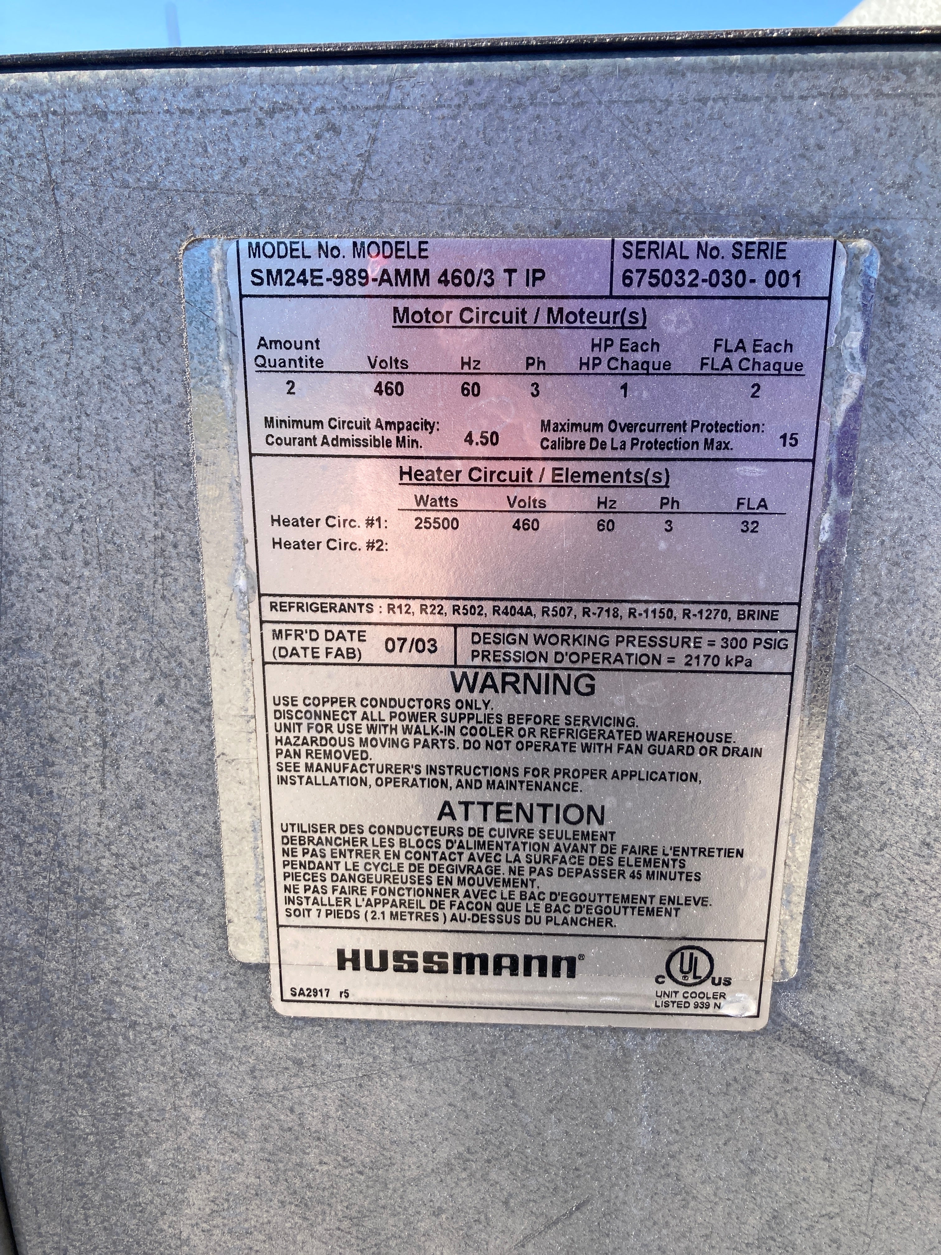 Hussmann SM24E-989-AMM 460/3 T IP Evaporator Coil - 12.975 TR, 2 Fan (Low/ Medium Temperature) This Evaporator coil can be used with either wet or frosted coils. A Frosted capacity of 9890 (BTUH / °F TD) with an estimated tonnage of 12(TR) @15TD(TR) @15TD. A wet capacity of 10380 (BTUH / °F TD) with an estimated tonnage of 12.975(TR) @15TD. An air flow of 18400 CFM. Recirculated top feed coils with electric defrost. 4 fins per inch and 2 fans. Previously used with freon. The evaporator coil is the component in your industrial refrigeration system that absorbs the heat from the air and cools the environment. The higher the tonnage or BTU capacity, the larger the area that can be cooled down or the cooler you can make the area. The evap coil works in coordination with your refrigeration system including screw or reciprocating compressors, evaporative condensers and pressure vessels. For more info contact our Genemco Sales team at (979) 268-7447 or sales@genemco.com