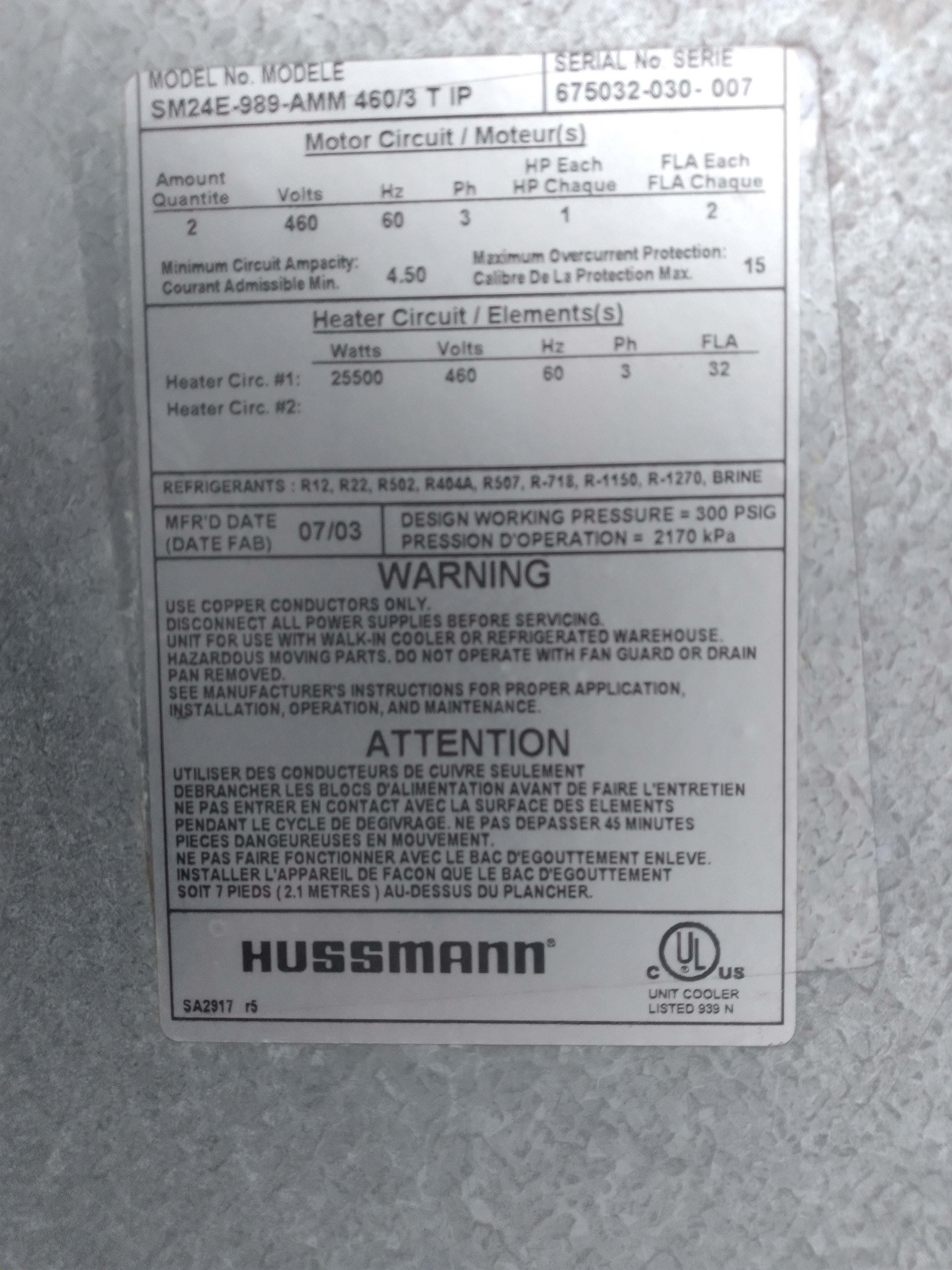 Hussmann SM24E-989-AMM 460/3 T IP Evaporator Coil - 12.975 TR, 2 Fan (Low/ Medium Temperature) This evaporator coil can be used with either wet or frosted coils. A Frosted capacity of 9890 (BTUH / °F TD) with an estimated tonnage of 12(TR) @15TD(TR) @15TD. A wet capacity of 10380 (BTUH / °F TD) with an estimated tonnage of 12.975(TR) @15TD. An air flow of 18400 CFM. Recirculated top feed coils with electric defrost. 4 fins per inch and 2 fans. Previously used with freon.