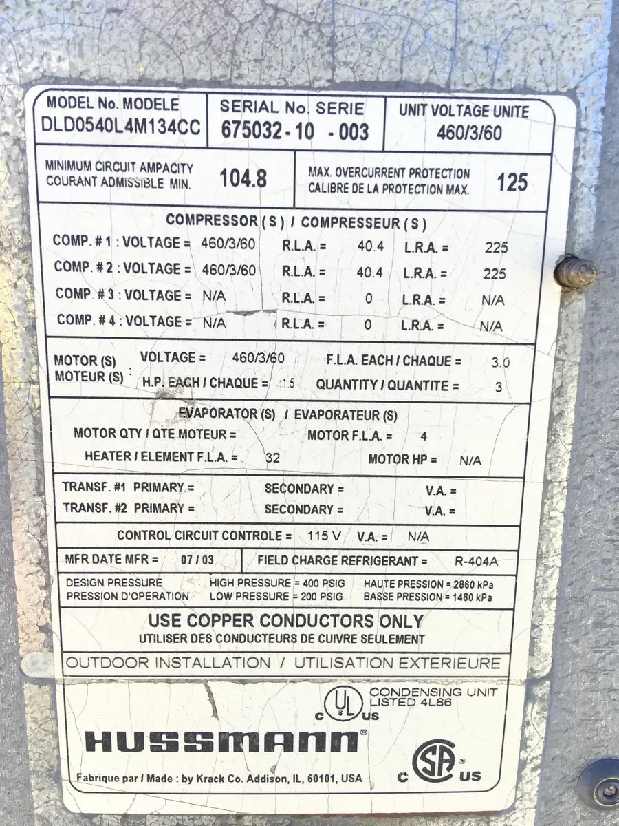 Hussmann Condensor: Model: DLD0540L4M134CC, Serial No: 675032-10-003, Unit Voltage: 460/3/60, Minimum circuit ampacity: 104.8, Max. overcurrent protection: 125, Design pressure: high pressure: 400 psig, low pressure: 200 psig, use copper cunductors only