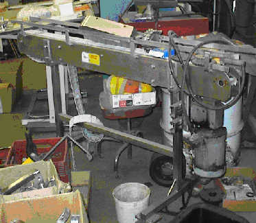 IDEAL Portable Conveyer stainless steel square Frame on casters 5 ½ inch long x 38 inch; 3 ¼ inch plastic chain, side rails; ½ HP - 86 RPM gear drive motor. 208/220/440 Volt, 15 to 20 years old [Good condition].