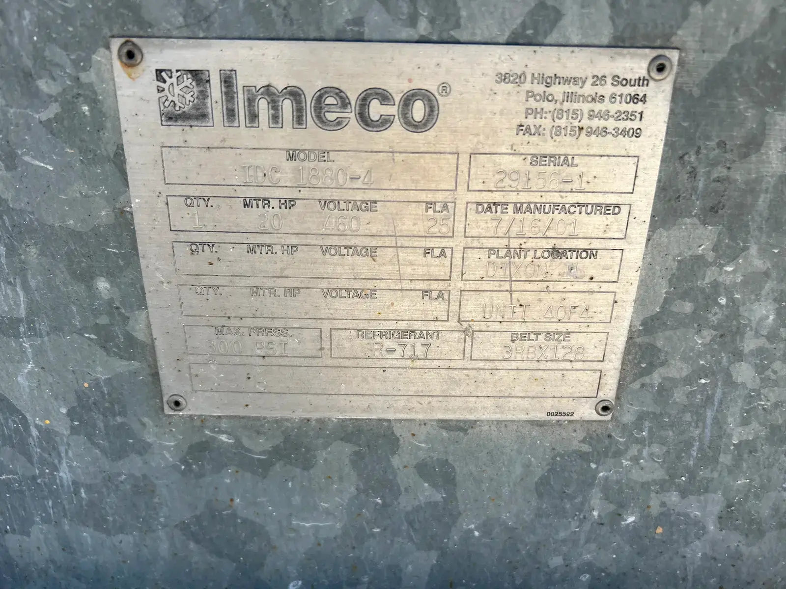 Imeco Single Evaporative Condenser. Model: IDC-1880-4. Serial No: 29156-1. Nominal Tons: 470 TR. Ammonia Tons: 333.25 TR. Max Pressure: 300 PSI. Previous Refrigerant: R-717. Belt Size: 3RBX128. Date Manufactured: 7/16/01